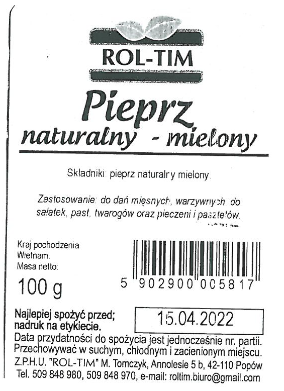 Ostrzeżenie publiczne dotyczące żywności: Wykrycie bakterii Salmonella w jednej partii pieprzu naturalnego mielonego, 100 g