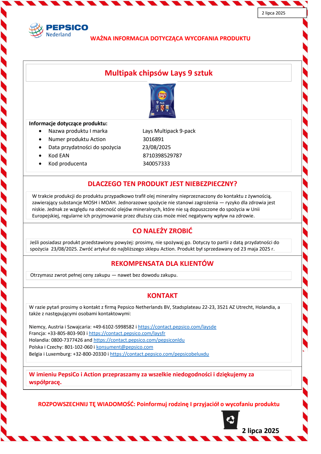 https://asset.action.com/image/upload/Code_99_Poster_3016891_PL_amdfmr Spółka Action prosi konsumentów o zwrot artykuł Chipsy ziemniaczane Lay's Multipack 9-pack, Kod producenta: 340057333 z datą minimalnej trwałości 23/08/2025 do najbliższego sklepu Action nawet bez posiadanego paragonu. Produkt sprzedawany był od 23 maja 2025 r.