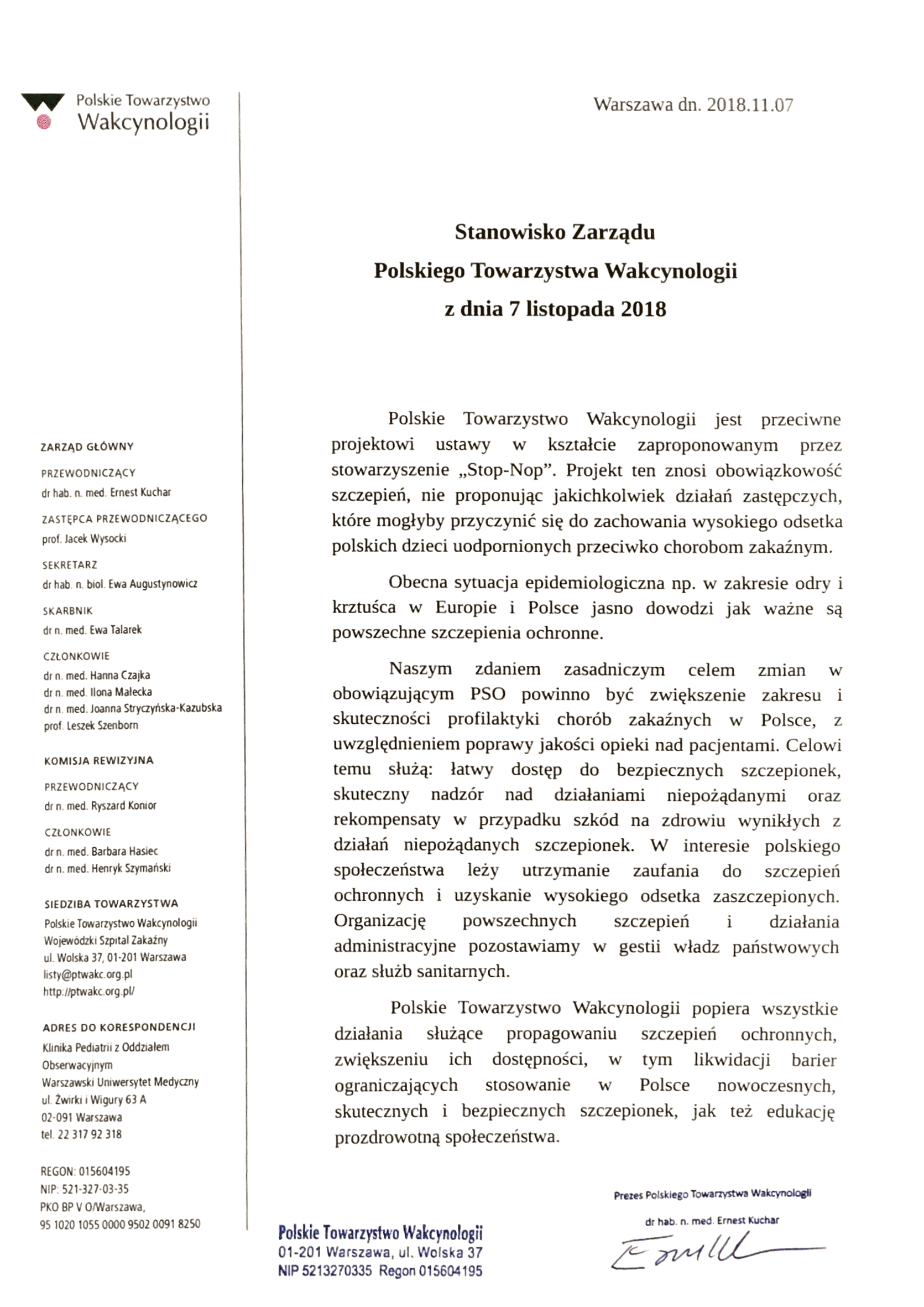 Zarządu Polskiego Towarzystwa Wakcynologii
