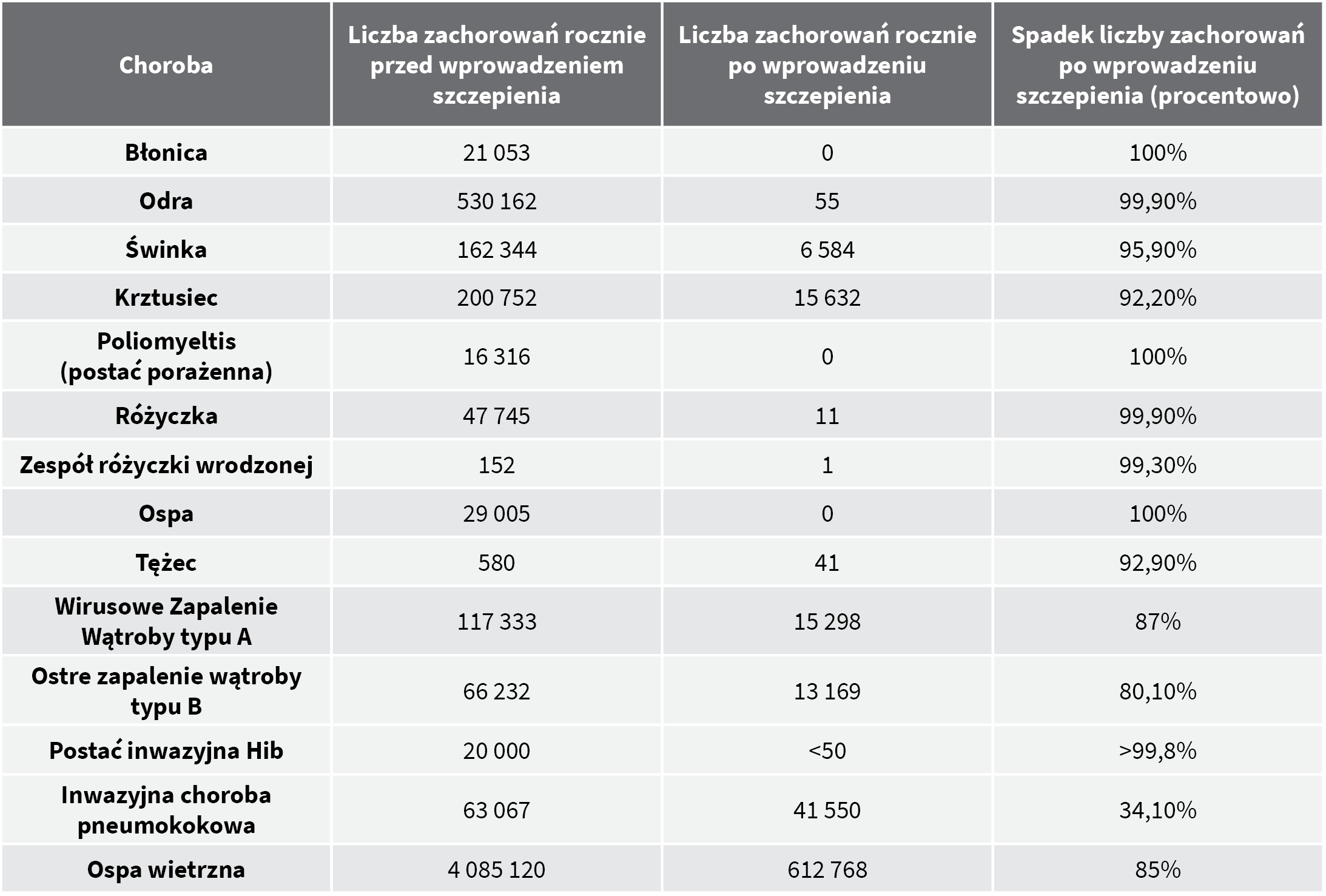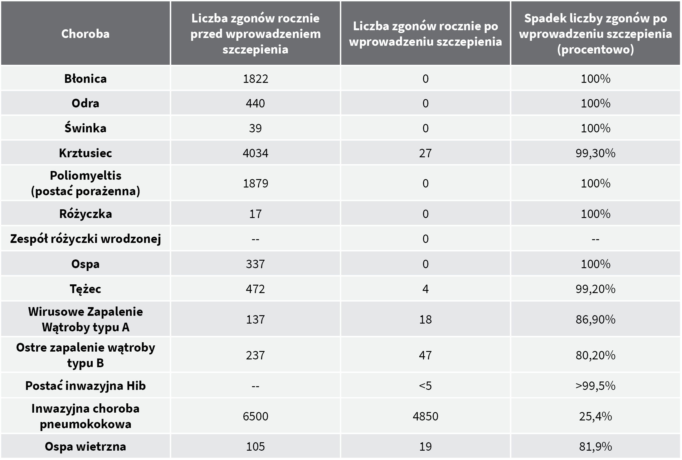 Tabela 2. Spadek liczby zgonów na choroby, na które istnieją szczepionki, przed i po wprowadzeniu szczepień
