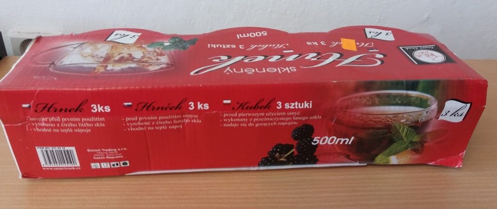 Na opakowaniu zestawu 3 szklanych kubków wymieniono podmiot odpowiedzialny za produkt: Elmich Trading s.r.o., Vlčkova 1064/6, PRAHA – Černý Most, Czech Republic.