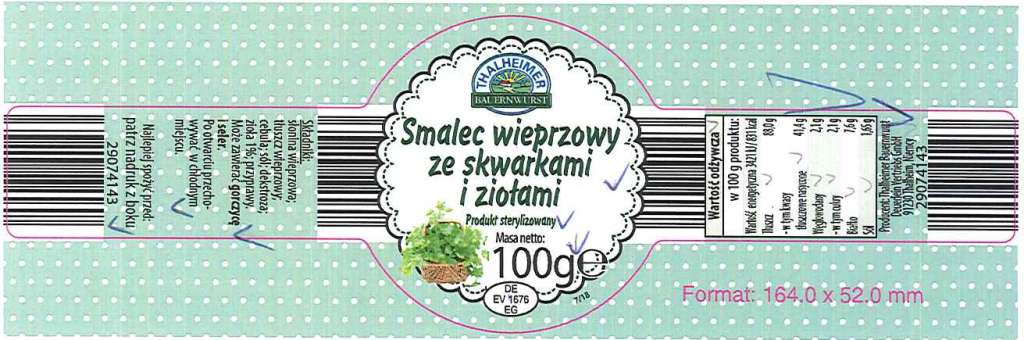 Wycofanie smalcu „Thalheimer Bauernwurst” o różnych wariantach smakowych ze względu na możliwość występowania fragmentów metalu (drutu)