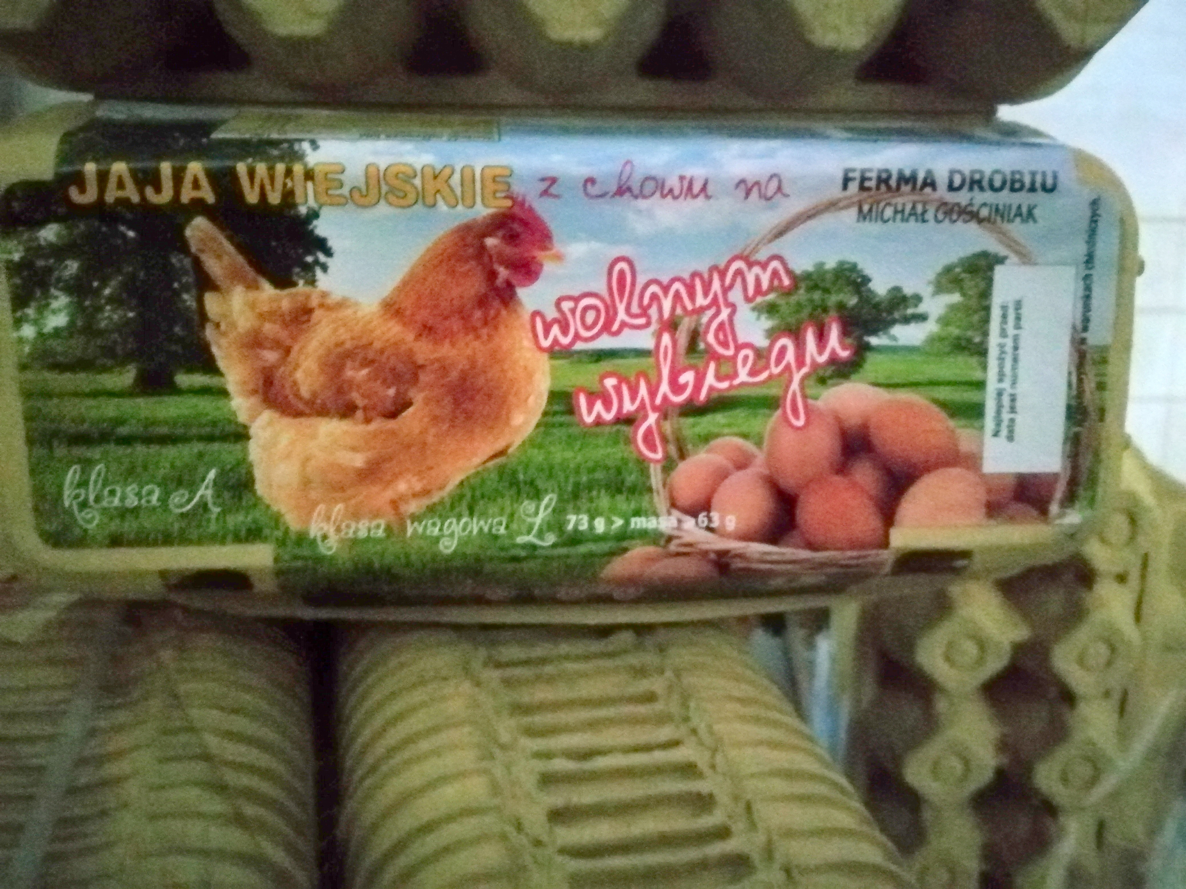 Jaja wiejskie z chowu na wolnym wybiegu, Ferma Drobiu Michał Gościniak, klasa A, wytłaczanki po 10 sztuk, klasa wagowa L kod producenta na skorupce jaja: 1-PL-30211340, nr partii: brak/ termin przydatności do spożycia: do 31.12.2019 r.