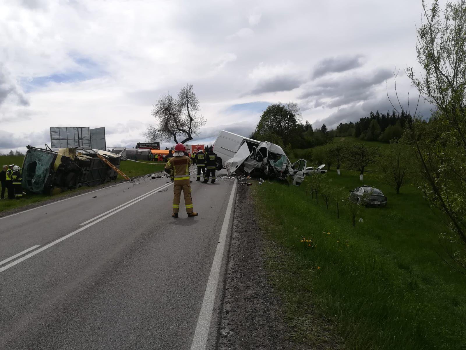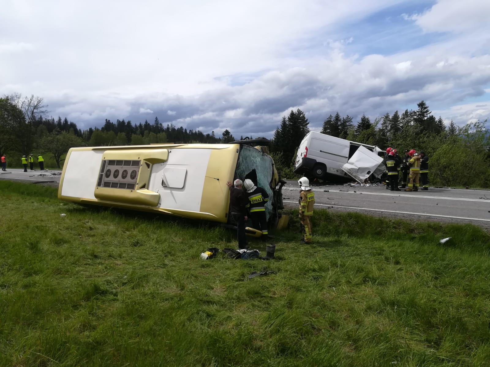 Karambol z udziałem autobusu linii regularnych, samochodu dostawczego i dwóch aut osobowych. Do wypadku doszło dziś, tj. 20 maja na Zakopiance. Jedna osoba zginęła, 10 zostało rannych.