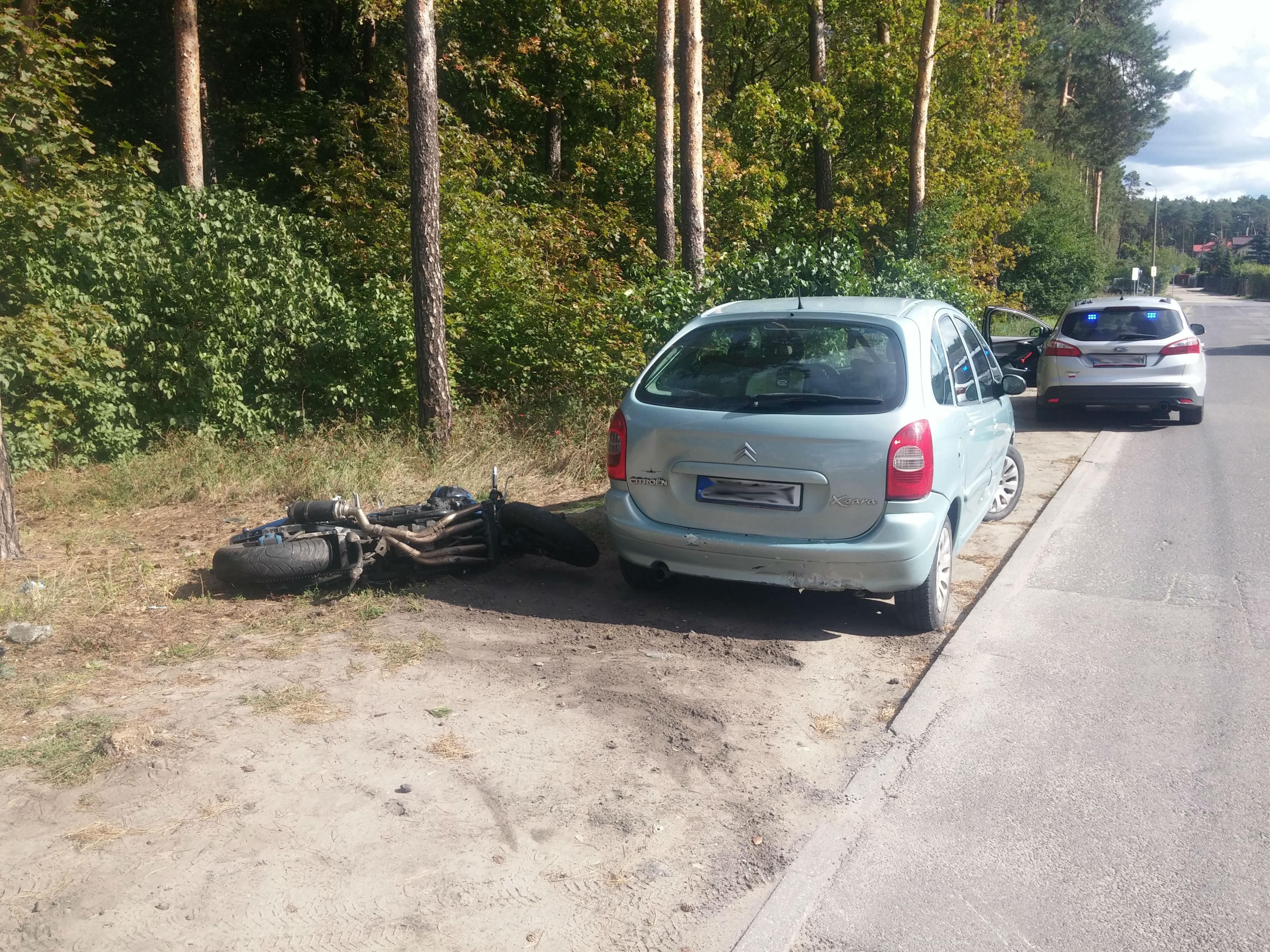 Po kilkusetmetrowej jeździe osiedlowymi uliczkami motocyklista stracił panowanie nad pojazdem. Przewrócił się, uszkodził jeden z pojazdów parkujących na poboczu. Mężczyzna porzucił motocykl i uciekł do pobliskiego lasu, po drodze gubiąc kask i telefon komórkowy. Przybyli na miejsce policjanci do poszukiwań uciekiniera użyli psa tropiącego. Ostatecznie kierowca trafił w ręce policji.