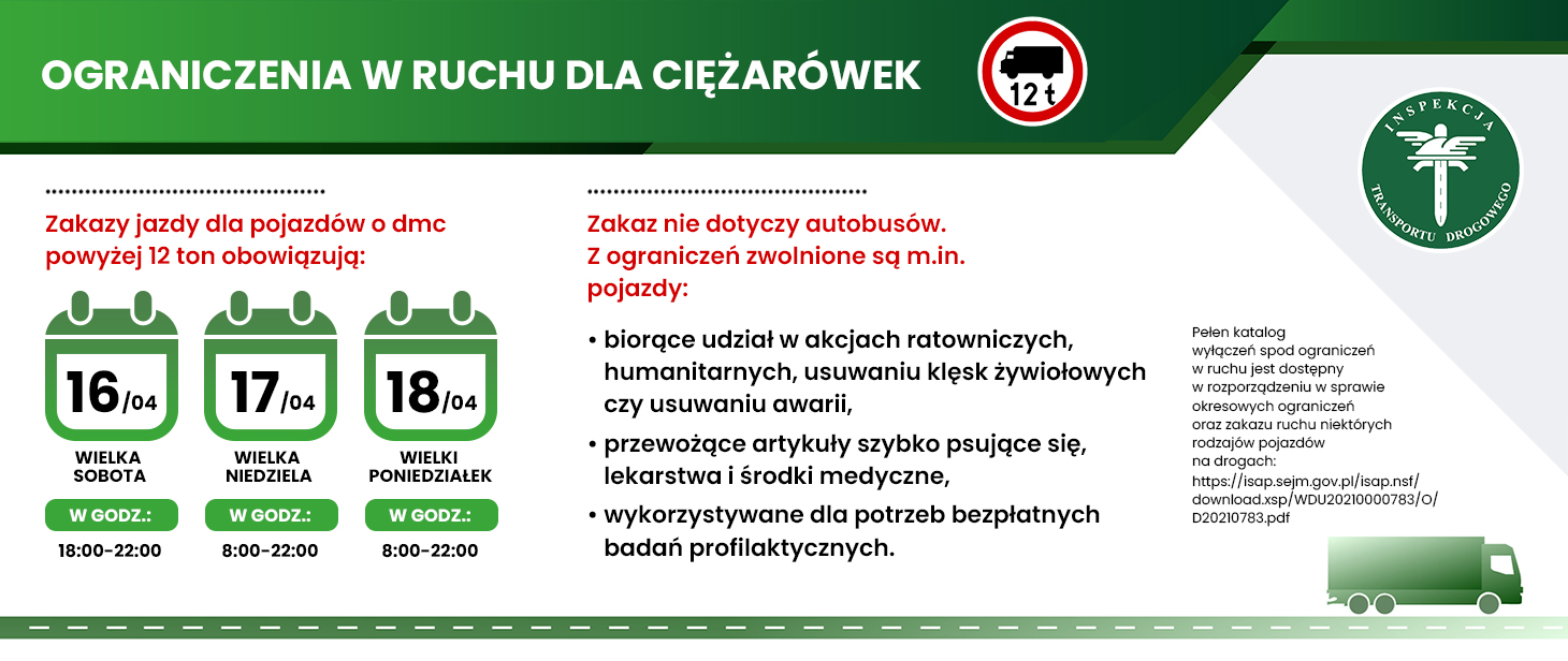 Inspekcja Transportu Drogowego przypomina, że w Wielką Sobotę oraz pierwszy i drugi dzień Wielkiej Nocy będzie obowiązywał zakaz ruchu dla pojazdów o dopuszczalnej masie całkowitej przekraczającej 12 t. Nie dotyczy on autobusów.