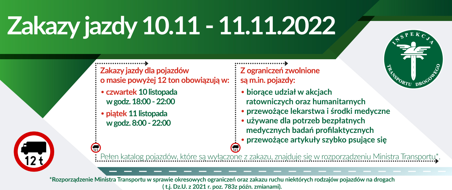 Ograniczenia w ruchu dla części pojazdów i zespołów pojazdów o dopuszczalnej masie całkowitej przekraczającej 12 ton, będą obowiązywać 10 listopada - od godz. 18:00 do godz. 22:00 oraz 11 listopada (Narodowe Święto Niepodległości) - od godz. 08:00 do godz. 22:00.