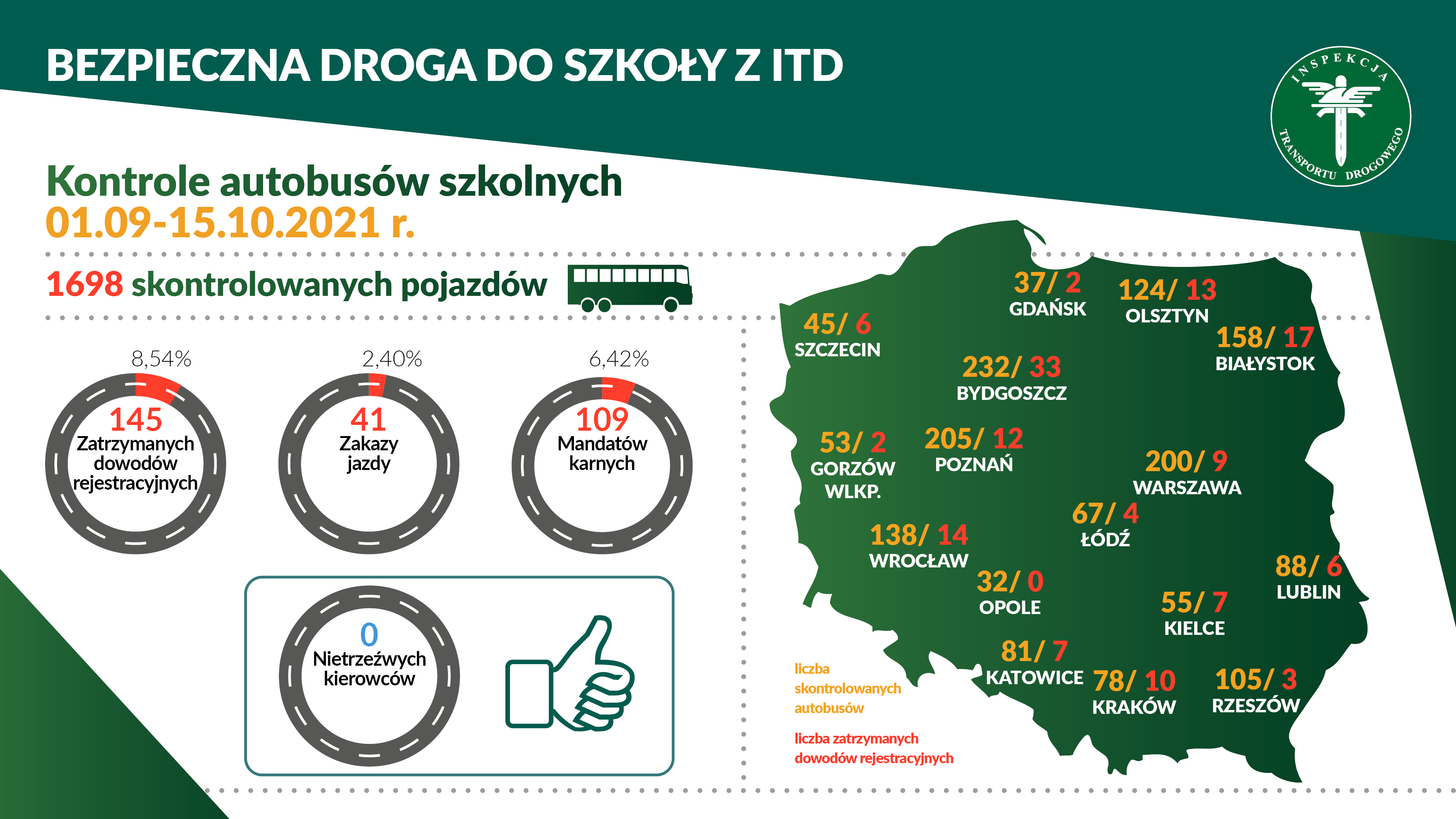 Kontrole autobusów, którymi codziennie dojeżdżają uczniowie, rozpoczęły się wraz z pierwszym szkolnym dzwonkiem. Inspektorzy sprawdzali przede wszystkim stan techniczny pojazdów, ale również trzeźwość kierowców i ich uprawnienia. Do połowy października skontrolowali 1698 autobusów.