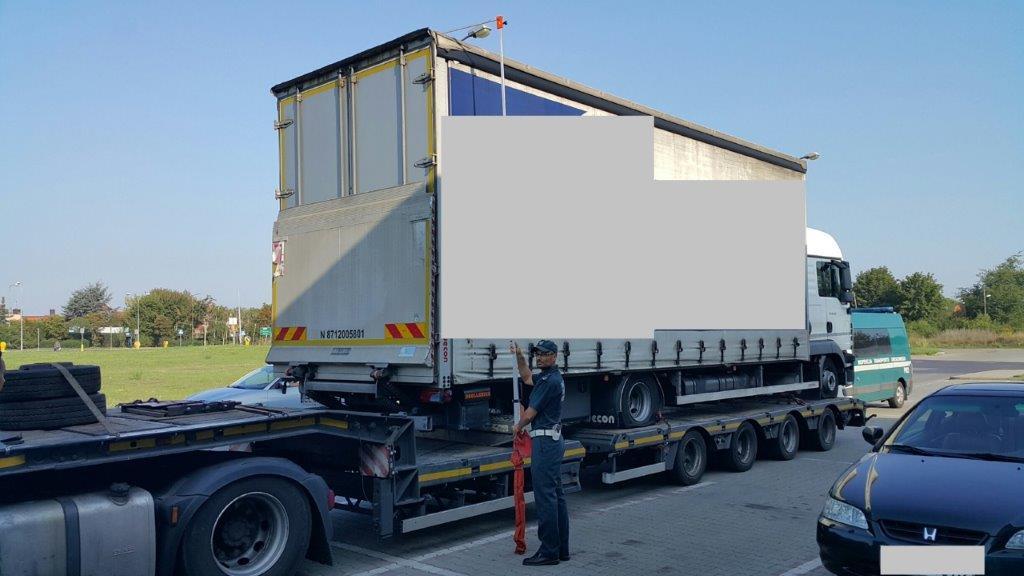 Wczesnym rankiem 31.08.2019 r. do KMP w Legnicy zadzwonił zdenerwowany pieszy, który był świadkiem uderzenia pojazdu ciężarowego w przejście nadziemne. Kierowca odjechał z miejsca zdarzenia. W wyniku interwencji policji pojazd został zatrzymany i przekazany inspektorom z dolnośląskiej Inspekcji Transportu Drogowego. Samochód przewoził na skrzyni ładunkowej uszkodzoną ciężarówkę. W pierwszej kolejności inspektorzy postanowili sprawdzić jego rzeczywiste wymiary. Okazało się, że zespół pojazdów z ładunkiem o dopuszczalnej wysokości 4 m mierzył 4,59 m, a jego długość wynosiła 16,7 m, przekraczając tym samym długość dopuszczalną o 0,2 m. Transport realizowała firma z okolic Lublina, a ładunek miał być przewieziony z Niemiec do Pabianic. Kierowca nie posiadał wymaganego zezwolenia na przejazd pojazdu nienormatywnego. Ponadto kierujący wjechał do Legnicy pojazdem, który ważył ponad 24 tony, naruszając tym samym zakaz wjazdu pojazdów o masie całkowitej ponad 12 ton. Kierowca wyjaśniał, iż wybrana trasa miała być alternatywą dla przejazdu autostradą A4, gdzie znajdują się niższe wiadukty. Otrzymał od inspektorów mandat karny. Poważniejsze konsekwencje grożą przewoźnikowi. Wobec przedsiębiorcy wszczęto postępowanie administracyjne, zagrożone karą za wykonywanie przewozu bez wymaganego zezwolenia. O zaistniałej sytuacji poinformowany został również zarządca drogi, który oceni uszkodzenia wiaduktu.