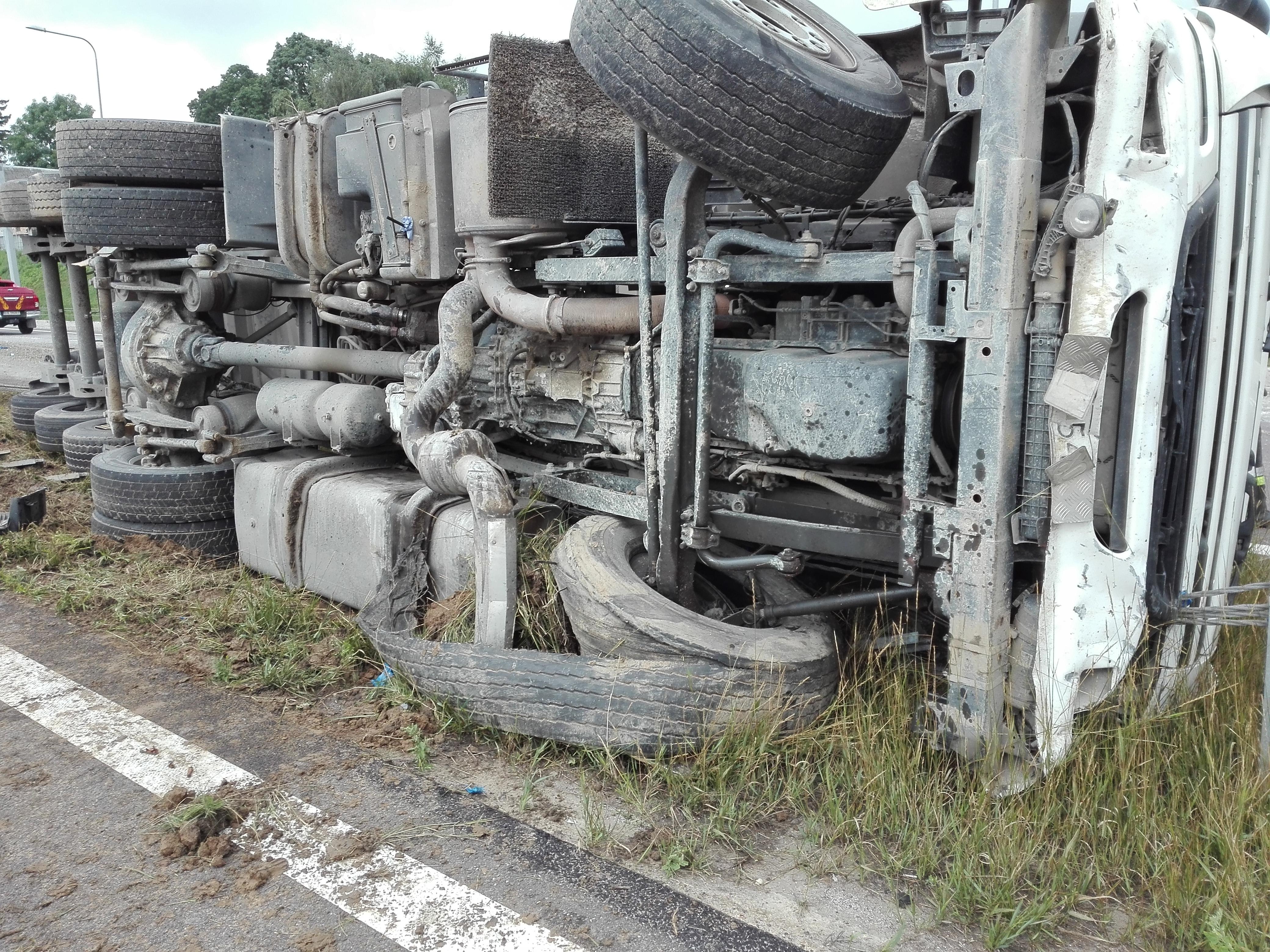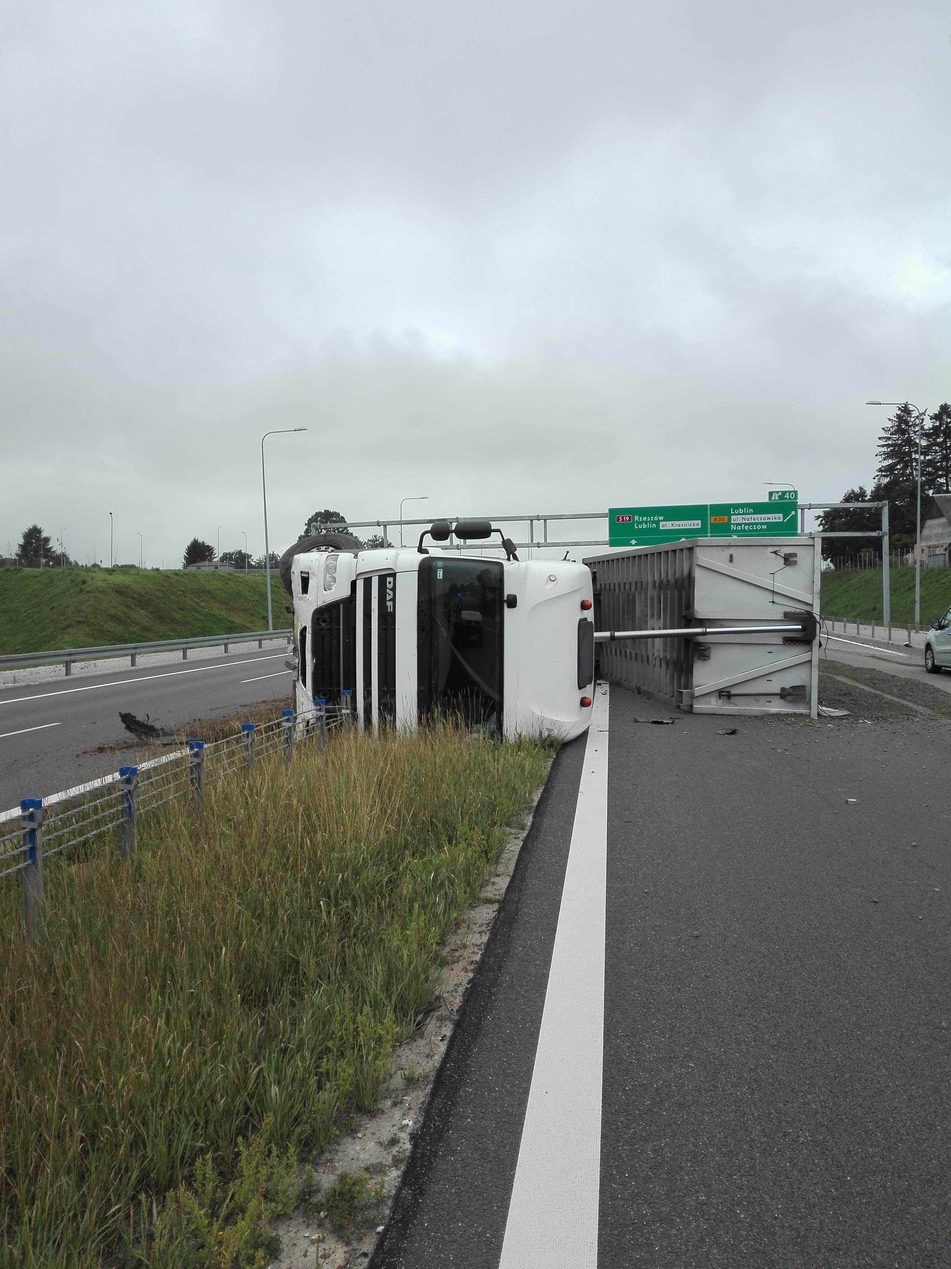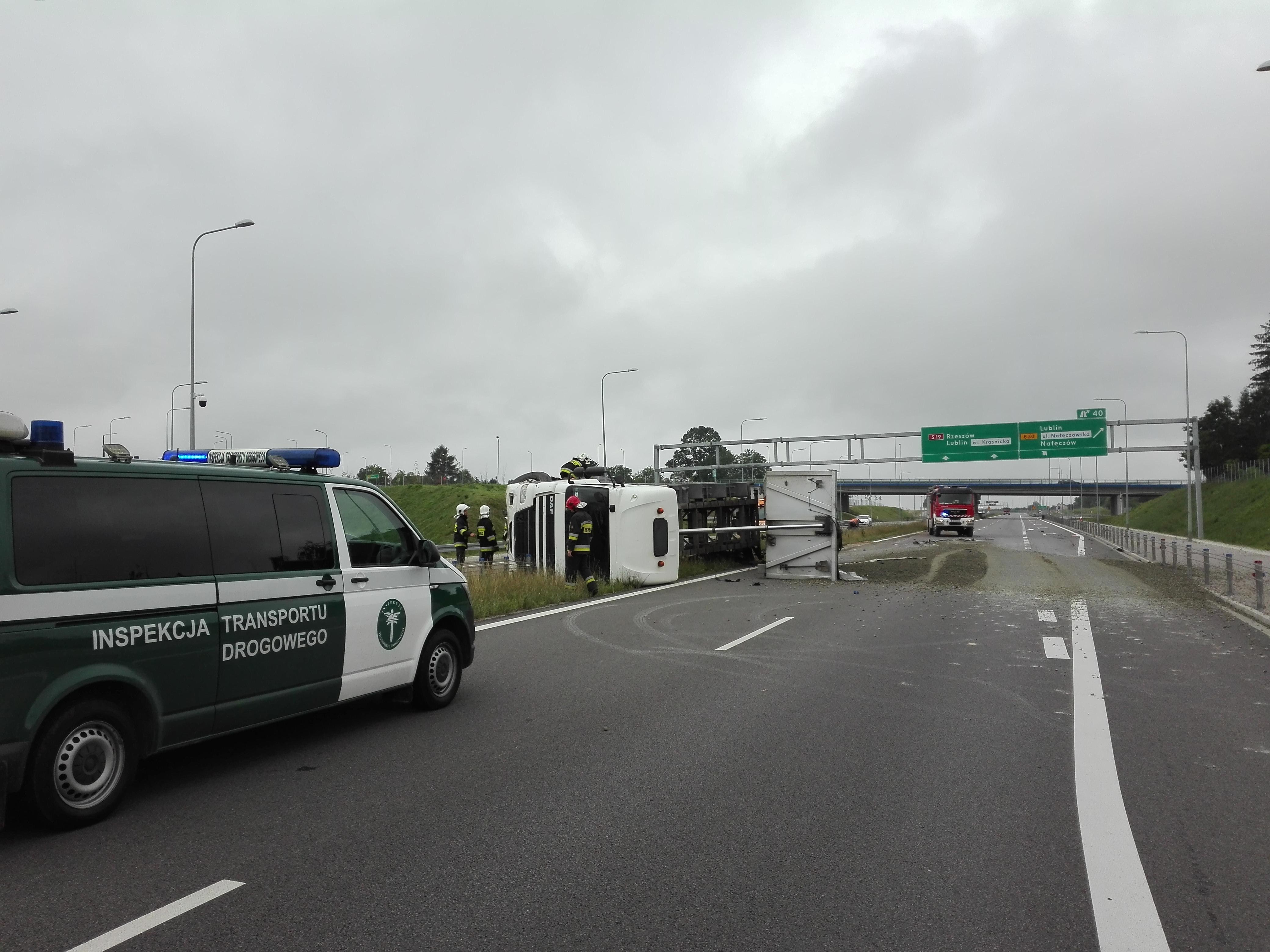 Do zdarzenia doszło we wtorek tuż przed godz. 9.00 na drodze S19. W jadącym obwodnicą Lublina samochodzie marki DAF, który przewoził kruszywo, pękła opona. Pojazd przewrócił się na linową barierkę energochłonną. Siła uderzenia była tak duża, że pojazd przebił się przez liny. Przewożone kruszywo wysypało się na jezdnię. Na miejsce wypadku jako pierwsi przybyli inspektorzy Inspekcji Transportu Drogowego. Stwierdzili wyciek paliwa. Inspektorzy wezwali policję i straż pożarną, która zabezpieczyła wyciek.