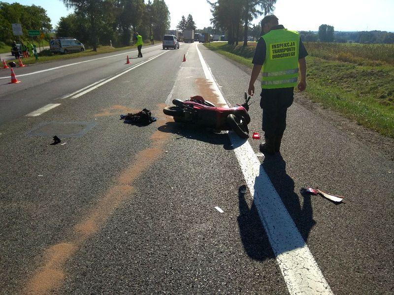 Inspektorzy z Wojewódzkiego Inspektoratu Transportu Drogowego w Kielcach zostali wezwani na miejsce wypadku drogowego do którego doszło w czwartek (5 września) w godzinach porannych w miejscowości Pacanów na drodze krajowej 73. Na miejscu zdarzenia pracowali również policjanci z Komisariatu Policji ze Stopnicy, policjanci z sekcji dochodzeniowej oraz z Wydziału Ruchu Drogowego z Buska Zdroju. Uczestnikami zdarzenia byli kierujący motocyklem, który w wyniku obrażeń został przewieziony do szpitala oraz kierowca prowadzący pojazd ciężarowy przewożący kontenery.