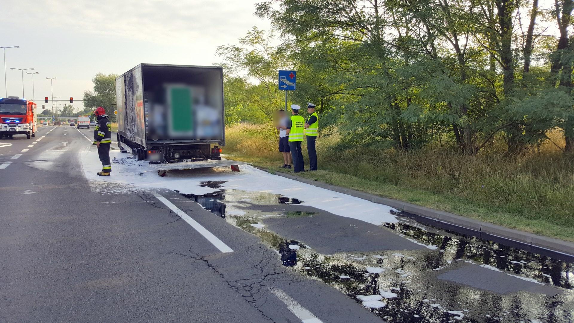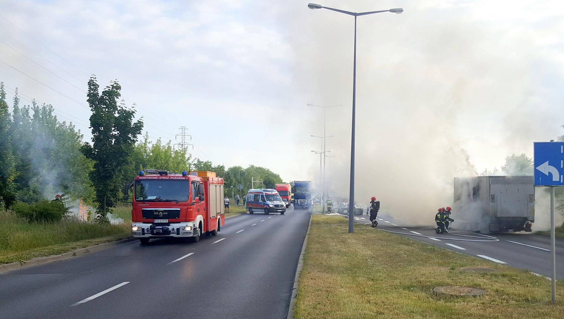 Tlący samochód przy ul. Szwajcarskiej w Poznaniu zauważyli w środę inspektorzy wyjeżdżający na patrol. Reakcja była natychmiastowa. Inspektorzy Wojewódzkiego Inspektoratu Transportu Drogowego w Poznaniu połączyli się z linią alarmową numer 112 i poinformowali o sytuacji dyżurnego. Następnie wstrzymali ruch nadjeżdżających pojazdów. We właściwym momencie, bo po chwili cały bok samochodu ciężarowego trawiony był przez płomienie. Zaraz potem nastąpił wybuch opony, która z wielką siłą pokonała ok. 50 metrów i po przedostaniu się na przeciwległy pas ruchu wpadła w zarośla, które stanęły w płomieniach. Na szczęście kierowca zdążył wcześniej bezpiecznie oddalić się z miejsca zdarzenia.
