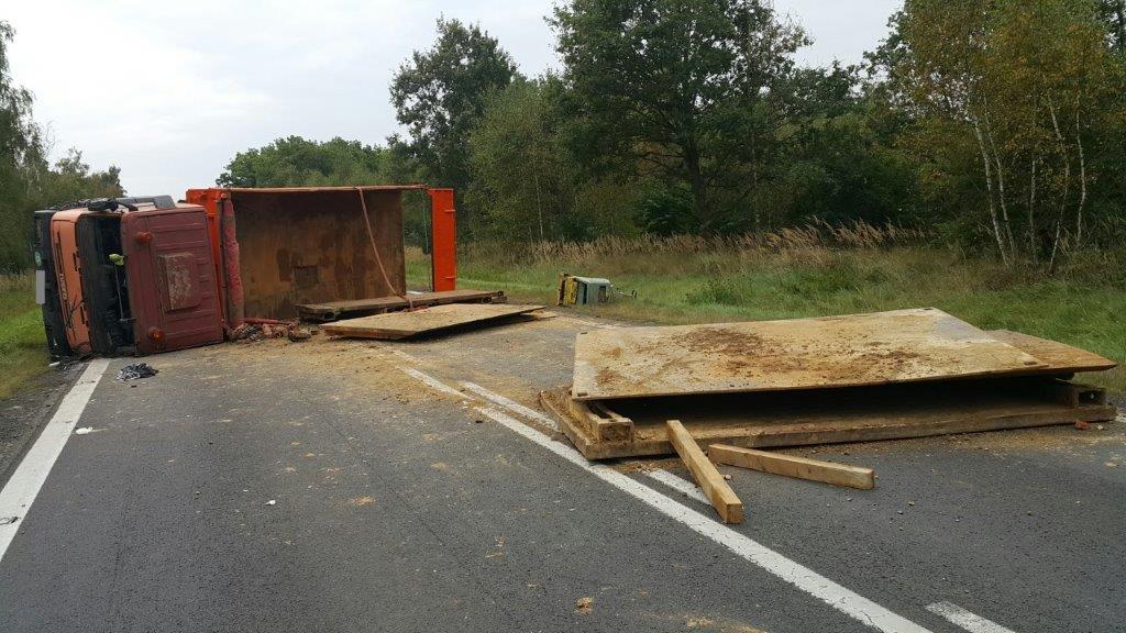 We wtorek (21 września), na krajowej 94-ce między Prochowicami a Kawicami doszło do wypadku z udziałem ciężarówki. Pojazd zjechał na pobocze i wywrócił się na bok. Z wywrotki wypadł na jezdnię przewożony ładunek - zagęszczarka i szalunki do wykopów ziemnych.