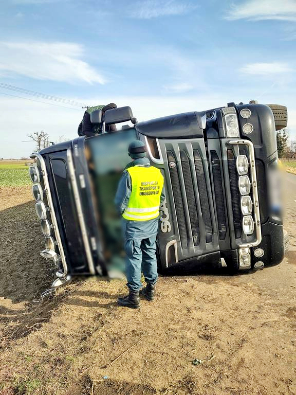 Zespół pojazdów przewożący trzodę chlewną wypadł z drogi i przewrócił się na bok. Ucierpiały transportowane w nim zwierzęta. Gnieźnieńscy funkcjonariusze Inspekcji Transportu Drogowego pobrali i zabezpieczyli dane z tachografu oraz karty kierowcy, aby pomóc w ustaleniu okoliczności i przyczyn zdarzenia.