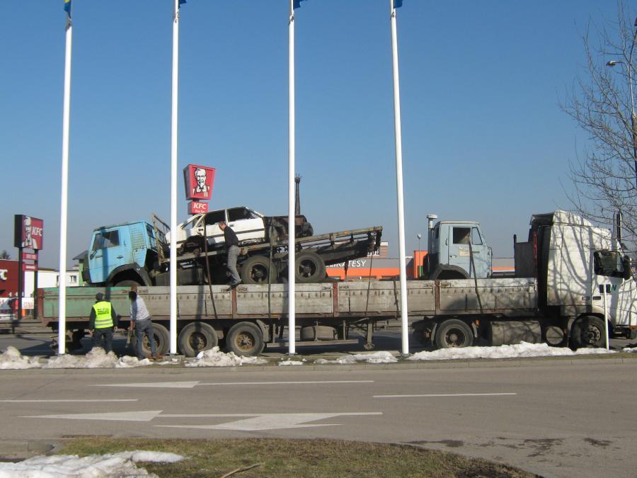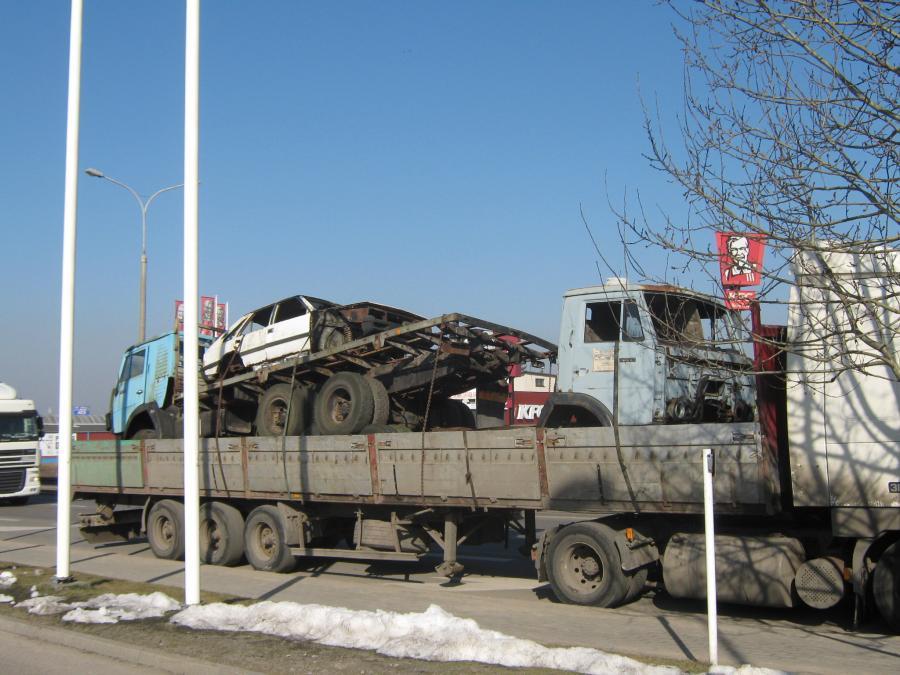 W dniu dzisiejszym ok. godz. 13 w miejscowości Rumia inspektorzy z Pomorskiego Wojewódzkiego Inspektoratu Transportu Drogowego zatrzymali do kontroli ciągnik siodłowy z naczepą na której były przewożone... 3 pojazdy - 2 kamazy, z czego na jednym z kamazów znajdował się polonez. Pojazdy pochodziły z licytacji komorniczej. Do zabezpieczenia "ładunku" wykorzystano jedynie 3 pasy i jeden łańcuch. Z ciągnika siodłowego wyciekały płyny eksploatacyjne, zaś w naczepie opony miały zbyt zużyty bieżnik. Jakby tego było mało w kabinie ciężarówki jechał jeden nadmiarowy pasażer.