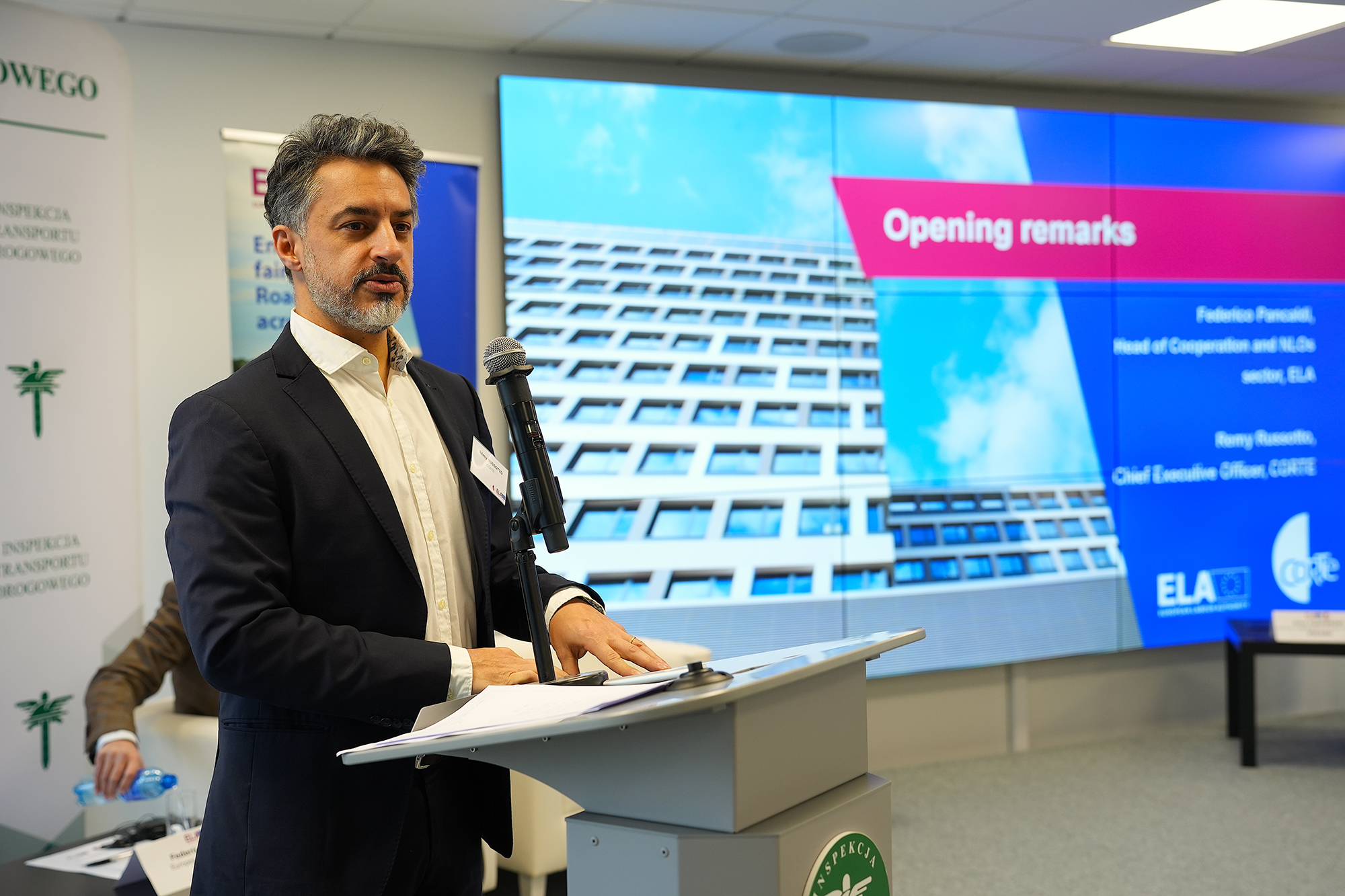 Dzisiejsza sesja jest pierwszą z serii tego typu wydarzeń, które będą realizowane w całej Europie przez Europejski Urząd ds. Pracy we współpracy z CORTE. To zaszczyt gościć dziś Państwa w siedzibie Głównego Inspektoratu Transportu Drogowego. Dziękuję, że przyjęliście zaproszenie i przybyliście do Warszawy, aby wspólnie porozmawiać o kwestiach dotyczących mobilności pracowników sektora transportu drogowego. Pakiet Mobilności jest nowym zestawem przepisów, do którego każdy z organów kontrolnych musi w odpowiedni sposób się przystosować, aby skutecznie egzekwować warunki wykonywania przewozów