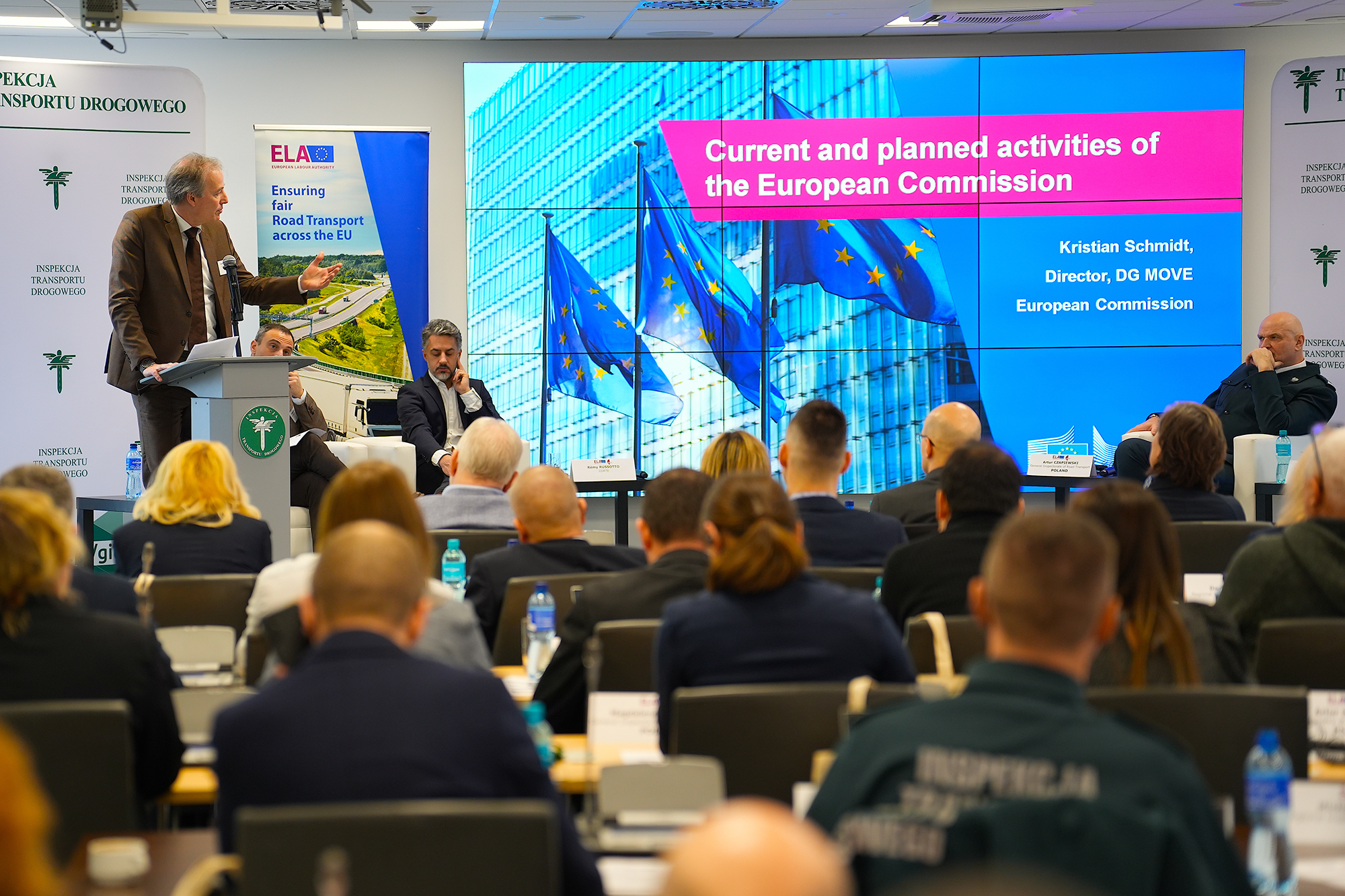 Z udziałem Głównego Inspektora Transportu Drogowego Artura Czapiewskiego, dyrektora ds. transportu lądowego w Dyrekcji Generalnej ds. Mobilności i Transportu Kristiana Schmidta, dyrektora wykonawczego Europejskiego Urzędu ds. Pracy Cosmina Boiangiu oraz dyrektora generalnego CORTE Rémy’ego Russotto odbywa się w siedzibie GITD sesja szkoleniowo-informacyjna, dotycząca egzekwowania przepisów socjalnych w transporcie. To pierwsze tego typu spotkanie, zorganizowane w cyklu szkoleniowym Europejskiego Urzędu ds. Pracy we współpracy z Konfederacją organów ds. egzekwowania prawa w transporcie drogowym.