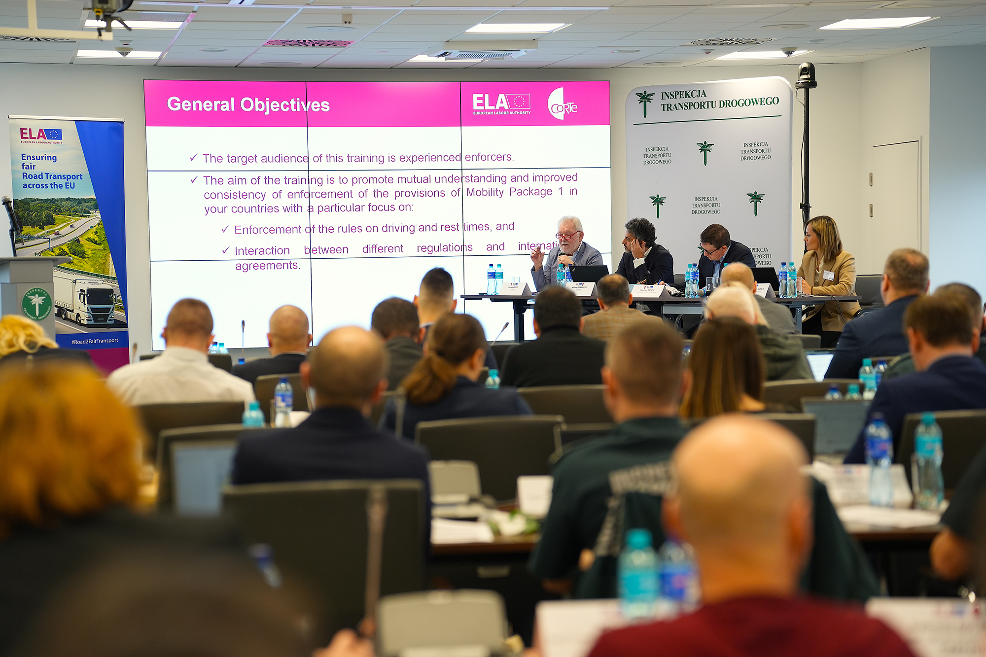 Pierwsza w Polsce i pierwsza w Europie sesja szkoleniowo-informacyjna, dotycząca egzekwowania przepisów socjalnych w transporcie, odbywa się w Warszawie, w siedzibie Głównego Inspektoratu Transportu Drogowego. Dwudniowe wydarzenie, którego celem jest promowanie skoordynowanego wdrażania i egzekwowania przepisów Pakietu Mobilności 1 we wszystkich państwach członkowskich Unii Europejskiej, organizowane jest przez Europejski Urząd ds. Pracy (ELA) i Konfederację organów ds. egzekwowania prawa w transporcie drogowym (CORTE), we współpracy z Głównym Inspektoratem Transportu Drogowego.
