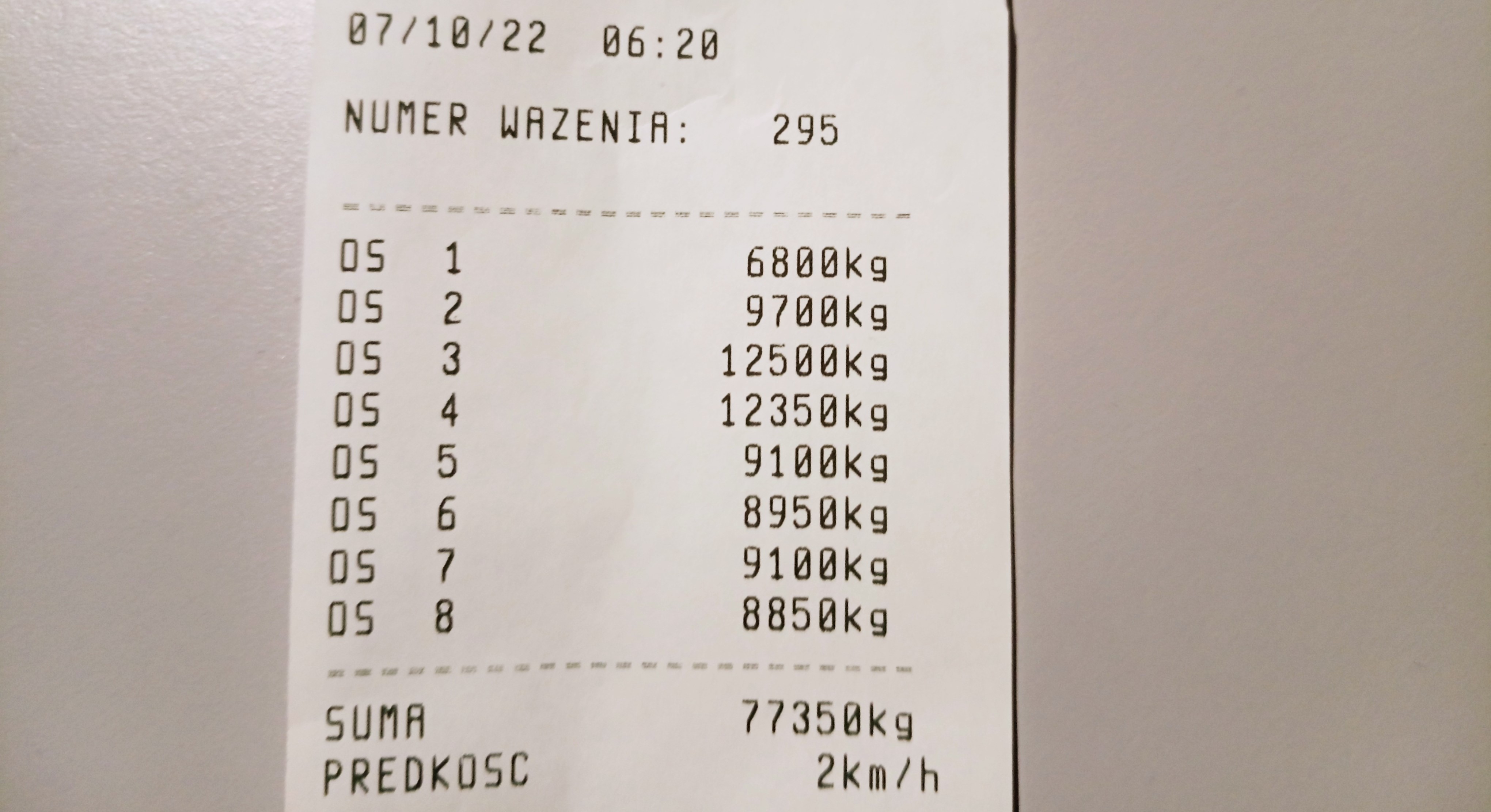 W piątek (7 października) rano, na autostradzie A1 w okolicach Włocławka, patrol ITD zatrzymał do kontroli drogowej 4-osiowy ciągnik siodłowy z 4-osiową naczepą niskopodwoziową. Zestaw należał do polskiego przedsiębiorcy i przewoził jego koparkę gąsienicową w rejon Inowrocławia. Kierowca okazał inspektorom zezwolenie kategorii IV na przejazd pojazdu nienormatywnego. Dokument ten uprawnia do przejazdu po drogach publicznych zespołem pojazdów o masie do 60 t. Muszą być także zachowane normatywne naciski osi pojazdów na drogę. Wymiary przewożonej koparki wskazywały, że gabaryt może być znacznie cięższy. Inspektorzy skierowali zestaw do punktu kontrolnego, gdzie mogli sprawdzić jego rzeczywistą masę całkowitą. Szybko potwierdzili swoje podejrzenia. Zespół pojazdów z ładunkiem ważył 77,35 t. Oprócz tego przekroczone były dopuszczalne naciski niemal wszystkich osi zestawu. Naciski potrójnej osi napędowej ciągnika siodłowego wynosiły 34,55 t przy normie 27 t. Z kolei każda z osi naczepy wywierała na drogę naciski przekraczające 8-tonową normę od 0,85 t do 1,1 t. Przy tak dużej masie oraz naciskach osi, przejazd pojazdu po drogach publicznych wymaga uzyskania zezwolenia kat. V. Wydanie takiego dokumentu wiąże się z wyznaczeniem przez zarządców dróg bezpiecznej trasy przejazdu, czyli uwzględniającej chociażby wytrzymałość mostów i wiaduktów. W tym przypadku takiej zgody nie było. W trakcie zatrzymania do kontroli gabaryt jechał też bez pilotażu. Zgodnie z przepisami całą jego trasę przejazdu powinien zabezpieczać przynajmniej jeden pojazd pilotujący. Inspektorzy wstrzymali nieprawidłowy transport i skierowali ciężarówkę na wyznaczony parking strzeżony. Odjedzie z niego dopiero po uzyskaniu zezwolenia kat. V. Kierowca został ukarany mandatem karnym. Wobec przewoźnika drogowego zostanie wszczęte postępowanie administracyjne. Grozi mu wysoka kara pieniężna.