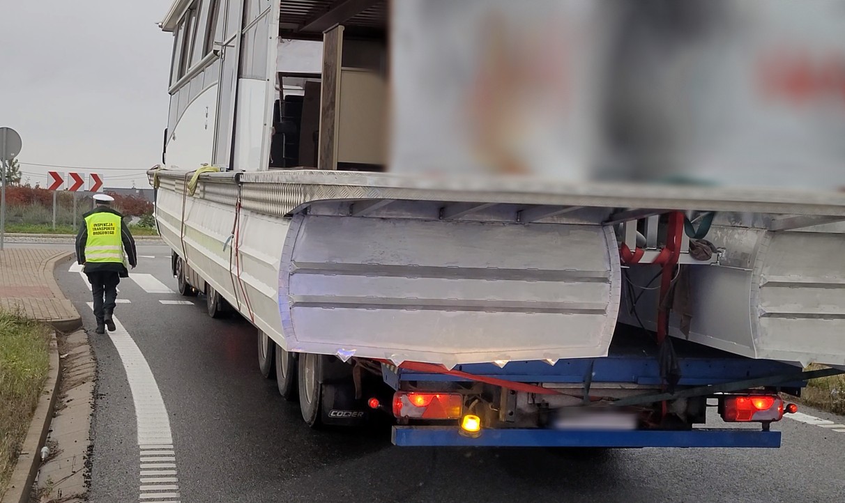 W czwartek (10 listopada) po południu, na krajowej „ósemce” koło Augustowa, inspektorzy ITD zauważyli nienormatywną ciężarówkę. Zestawem należącym do polskiego przedsiębiorcy był przewożony katamaran. Gabaryt był na tyle szeroki, że zmuszał uczestników ruchu jadących z przeciwka do poruszania się poboczem drogi. Funkcjonariusze zatrzymali nienormatywny zespół pojazdów do kontroli drogowej i stwierdzili szereg nieprawidłowości. Długość zestawu z ładunkiem wynosiła 18,1 m zamiast dopuszczalnych 16,5 m. Ciężarówka z przewożonym statkiem była również za wysoka i za szeroka. Jej wysokość wynosiła 4,37 m zamiast przepisowych 4 m, a szerokość 4,27 m zamiast dozwolonych 3 m. Gabaryt nie został prawidłowo oznakowany oraz na trasie jego przejazdu nie było wymaganych dwóch pojazdów pilotujących. Kierowca nie okazał wymaganego zezwolenia na przejazd nienormatywnego pojazdu po drogach publicznych. Nie miał także wypisu z zezwolenia na wykonywanie zawodu przewoźnika drogowego lub wypisu z licencji. Katalog stwierdzonych nieprawidłowości uzupełnił jeszcze brak ważnych badań lekarskich i psychologicznych oraz brak ważnego szkolenia okresowego kierowcy. Z kolei ciągnik siodłowy nie miał ważnych badań technicznych, a naczepa nie miała ubezpieczenia odpowiedzialności cywilnej (OC).