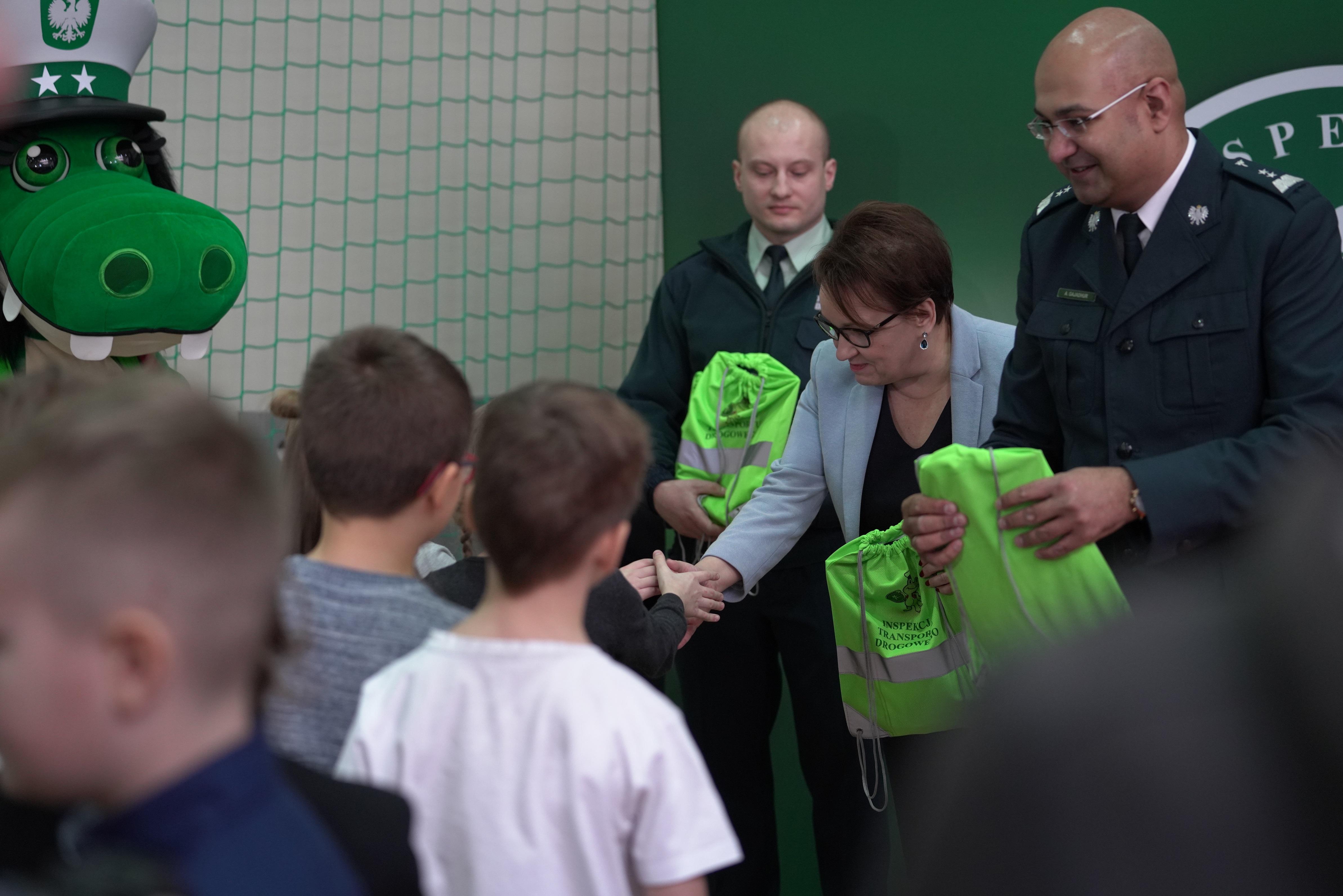 Wszystkie dzieci biorące udział w lekcji bezpieczeństwa otrzymały od Minister Edukacji Narodowej, Szefa ITD oraz Krokodylka Tirka i Pani Krokodylowej prezenty. Wśród tych upominków nie mogło zabraknąć odblaskowych elementów, które poprawią ich widoczność, a tym samym zwiększą bezpieczeństwo na drodze.
