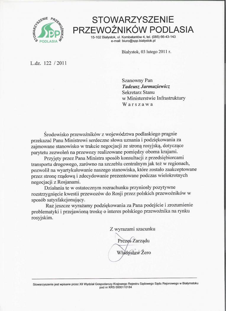 Środowisko transportowców jest wdzięczne Panu Ministrowi Tadeuszowi Jarmuziewiczowi za zakończenie patowej sytuacji i wynegocjowanie kontyngentu zezwoleń do Rosji dla polskich przewoźników. Zamieszczamy pismo Stowarzyszenia Przewoźników Podlasia w tej sprawie.