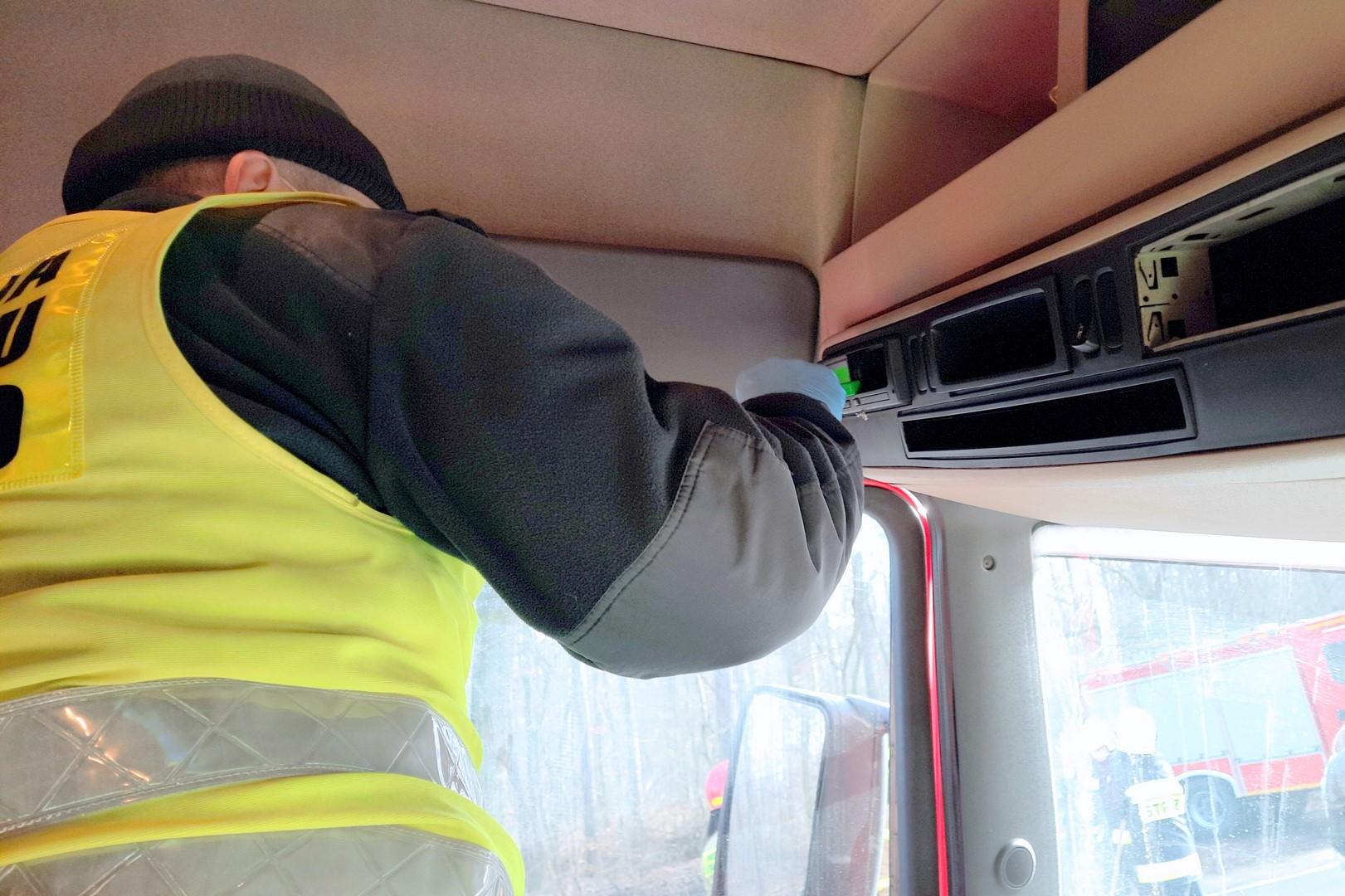 Inspektorzy pobrali dane z tachografu cyfrowego ciężarówki biorącej udział w wypadku. Zapisy odnośnie czasu pracy kierującego i prędkości zestawu zostały przekazane policjantom wyjaśniającym przebieg zdarzenia.