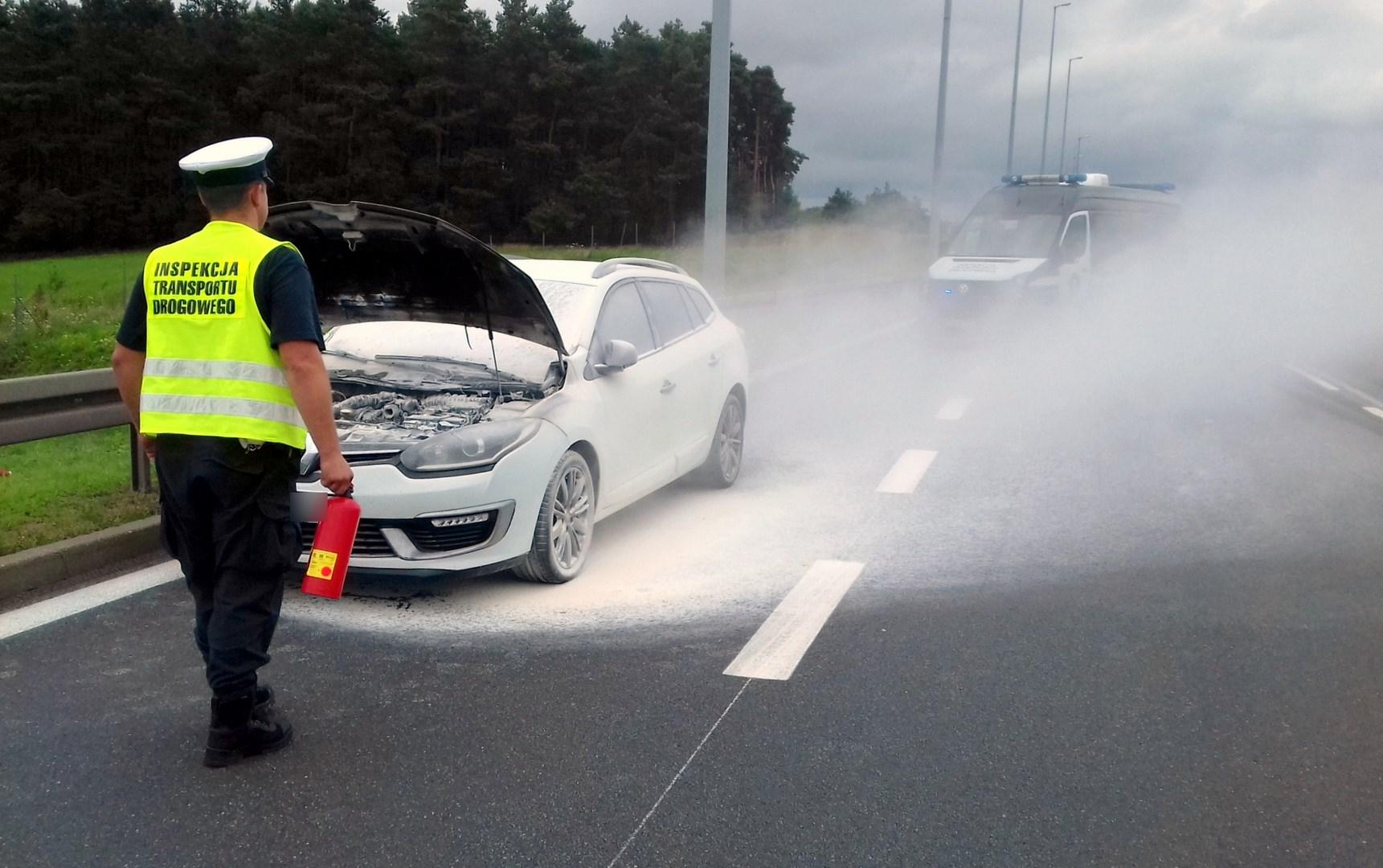 Inspektor w roli strażaka. Kiedy na A2 zapaliło się auto osobowe, ITD zareagowała natychmiast. Pożar ugaszono zanim rozprzestrzenił się na inne samochody.