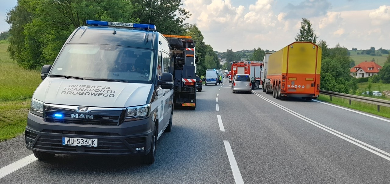 Około 40-letni mężczyzna z półtorarocznym synem zginęli w wypadku drogowym, w którym brały udział dwa samochody osobowe i ciężarówka. Na miejsce tragicznego zdarzenia zostali wezwani inspektorzy małopolskiej Inspekcji Transportu Drogowego, którzy zabezpieczyli dane cyfrowe z tachografu ciężarówki. Materiał ten posłuży śledczym do ustalania szczegółowych okoliczności wypadku.