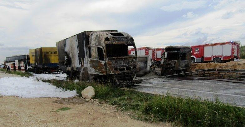 Do wypadku doszło w czwartek (2 lipca) na krajowej "jedynce" w miejscowości Bogusławice koło Częstochowy. Uczestniczyły w nim zestaw przewożący beton w naczepie-silosie, autobus ukraińskiego przewoźnika i samochód ciężarowy z przyczepą, którym przewożono ok. 15 ton materiałów niebezpiecznych (farb). W wyniku wypadku całkowicie spaliły się kabiny obu ciężarówek. Na szczęście ogień nie zdążył objąć ładunku łatwopalnego i autobusu, którym podróżowali obywatele Ukrainy.