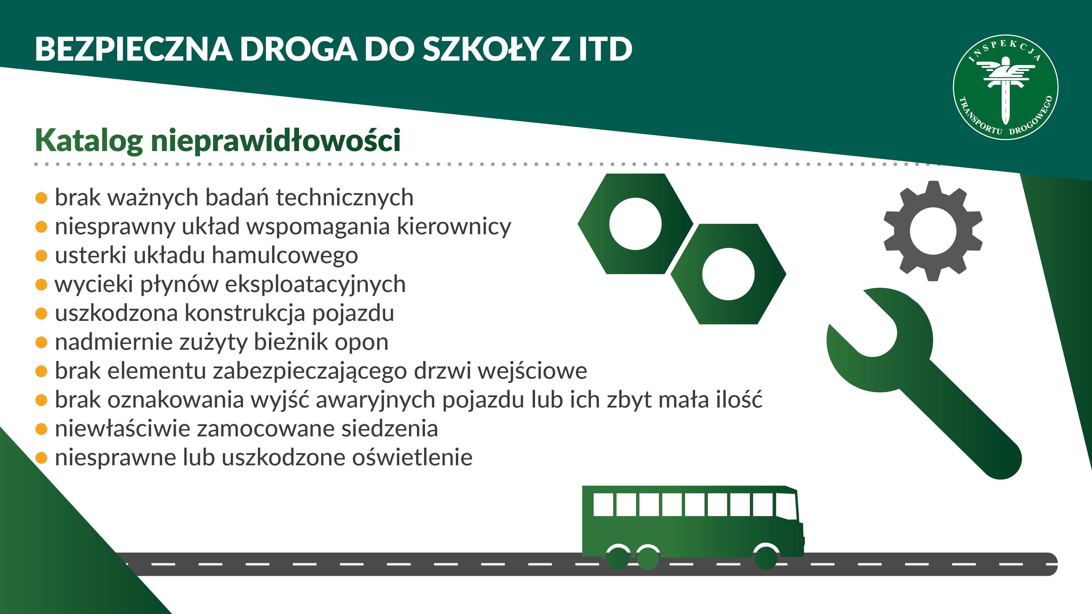 Najczęstszą przyczyną zatrzymania dowodów rejestracyjnych autobusów szkolnych były usterki układu kierowniczego, hamulcowego, zawieszenia, wycieki płynów eksploatacyjnych, uszkodzone ogumienie. Niemal cały wachlarz tego typu nieprawidłowości stwierdzili inspektorzy ITD z Białegostoku w trakcie kontroli autobusów szkolnych na terenie gminy Rutki. Kontrola 4 pojazdów zakończyła się zatrzymaniem 3 dowodów rejestracyjnych i wydaniem 2 zakazów dalszej jazdy. Małopolscy inspektorzy w trakcie kontroli tylko jednego autobusu w gminie Miechów, którym chwilę wcześniej do szkoły jechało 15 dzieci, stwierdzili m.in. niesprawny hamulec postojowy i wycieki płynów eksploatacyjnych. Niektóre ze skontrolowanych pojazdów nie miały również ważnych badań technicznych. Tak było np. w trakcie kontroli przeprowadzonych w pobliżu Tarnowa, gdzie ten sam przewoźnik wykorzystywał do przewozu dzieci autobusy bez ważnych badań technicznych.