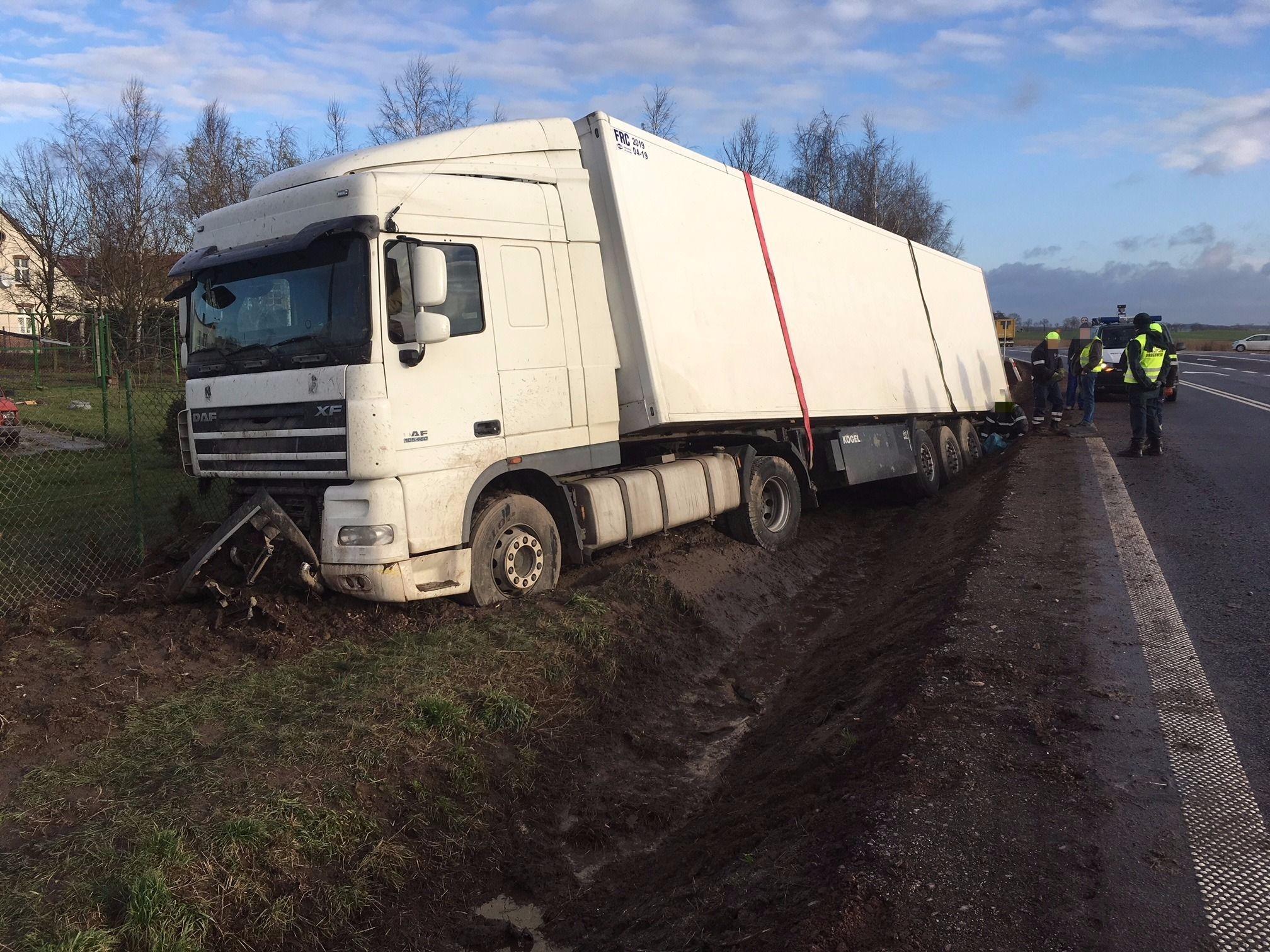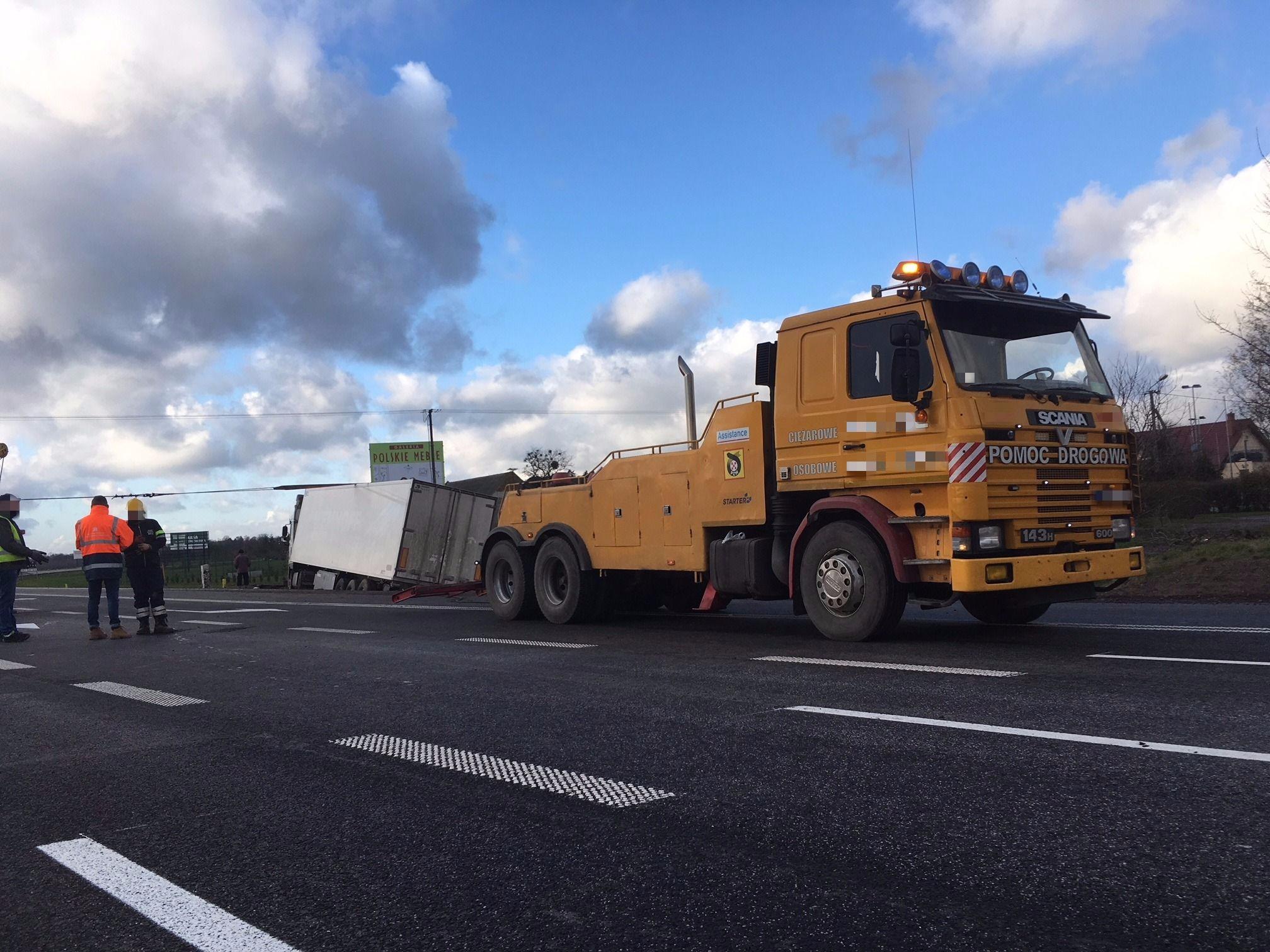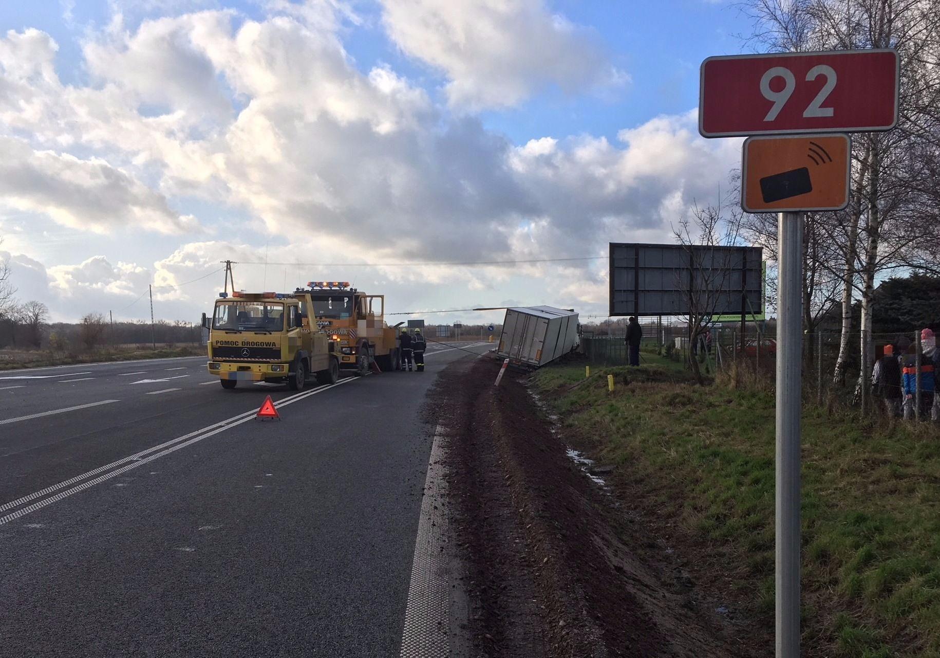 Samochód ciężarowy z naczepą został wyciągnięty z rowu późnym popołudniem przez specjalistyczny pojazd pomocy drogowej. Na czas jego usunięcia z pasa drogowego inspektorzy ITD wspólnie z policjantami i strażakami zamknęli odcinek drogi krajowej, kierując samochody tymczasowym objazdem.