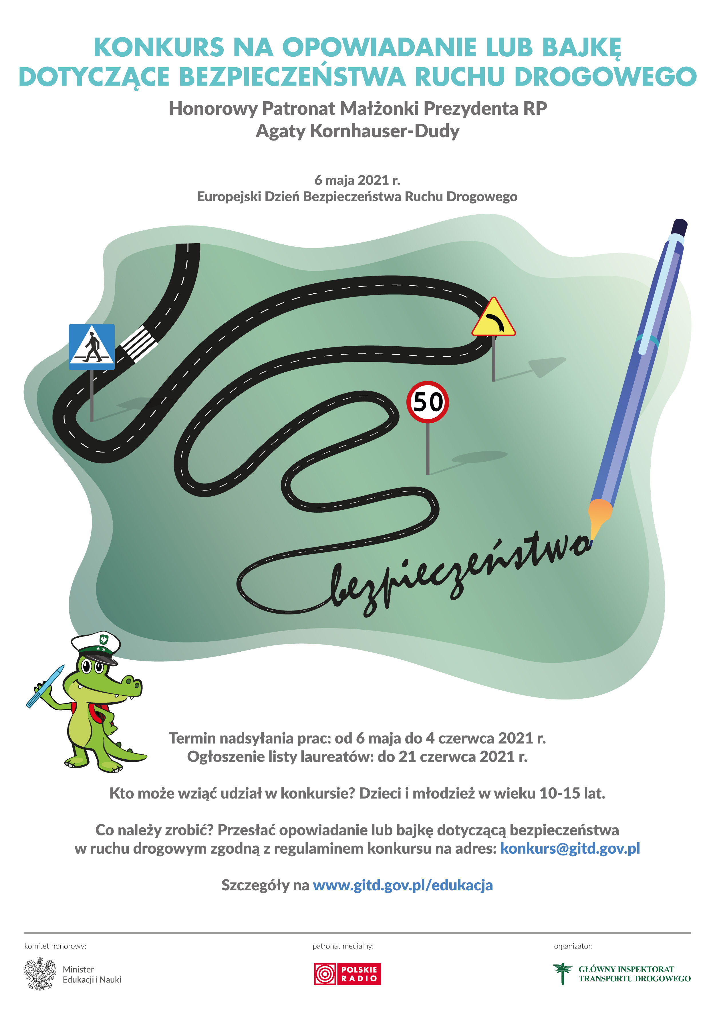 Konkurs na najciekawsze opowiadanie lub bajkę dotyczące bezpieczeństwa ruchu drogowego, objęty Honorowym Patronatem przez Małżonkę Prezydenta RP Panią Agatę Kornhauser-Dudę, ruszył 6 maja 2021 r. w Europejskim Dniu Bezpieczeństwa Ruchu Drogowego. GITD zaprosił do udziału w nim dzieci i młodzież w wieku 10-15 lat. Konkurs spotkał się z wielkim zainteresowaniem. Do 4 czerwca 2021 r. organizatorzy otrzymali ponad 1100 niezwykle różnorodnych i ciekawych prac. Decyzją Komisji Konkursowej ogłoszenie listy laureatów konkursu nastąpi w terminie do 10 września 2021 r. Lista zostanie zamieszczona na stronie internetowej GITD i w mediach społecznościowych.