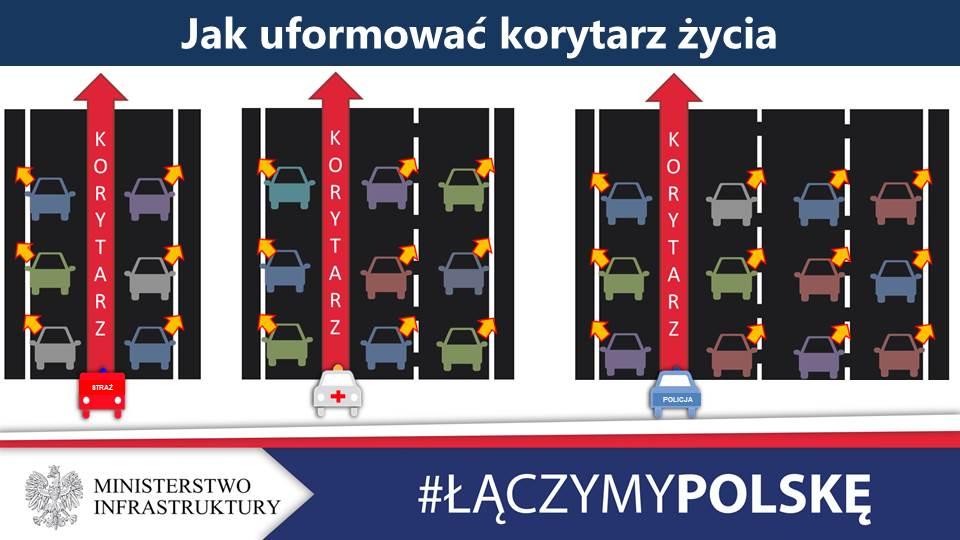 Jak utworzyć korytarz życia? Kierowcy poruszający się lewym skrajnym pasem mają obowiązek zjechać na lewo, a poruszający się pozostałymi pasami - na prawo. Kierowcy mogą kontynuować jazdę po uprzednio zajmowanym pasie ruchu dopiero po przejeździe pojazdu uprzywilejowanego. Z utworzonego korytarza życia mogą korzystać tylko i wyłącznie pojazdy uprzywilejowane.