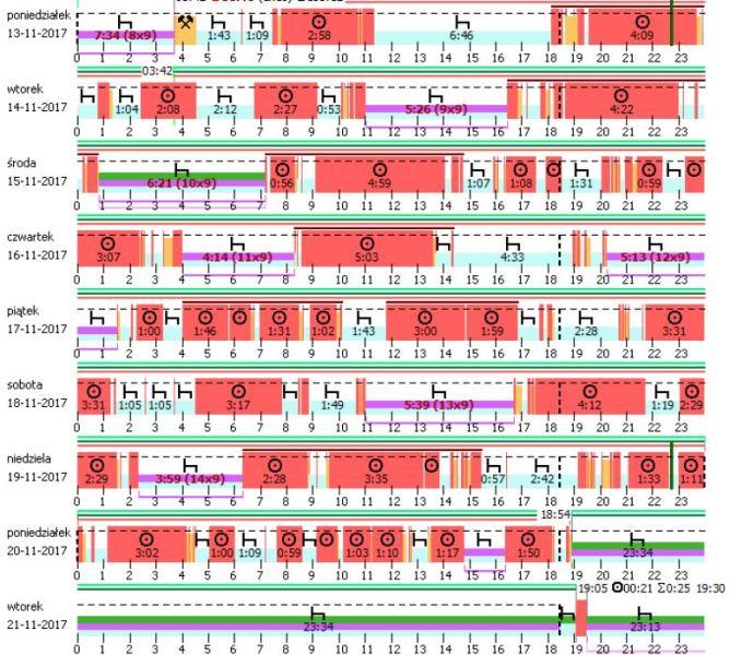Analiza danych zapisanych na karcie kierowcy oraz w tachografie cyfrowym z ostatnich zaledwie 29 dni ujawniła liczne naruszenia norm prowadzenia pojazdów, wymaganych przerw w prowadzeniu i odpoczynków. Przedsiębiorca o ponad 3 godziny przekraczał dopuszczalny 4,5-godzinny okres prowadzenia pojazdu bez wymaganej przerwy, a normą było odbieranie przez niego po całym dniu jazdy zaledwie 3-godzinnych odpoczynków, zamiast przepisowych 9 lub 11 godzin. Przez 4 tygodnie przedsiębiorca nie odebrał także ani jednego odpoczynku tygodniowego w minimalnym wymiarze 24 godzin. Powyższe skutkowało także znacznym przekroczeniem dopuszczalnych tygodniowych i dwutygodniowych okresów prowadzenia pojazdu. W ciągu tygodnia przedsiębiorca, zamiast przepisowych 56 godzin, prowadził pojazd przez ponad 77 godzin, a w ciągu dwóch kolejnych tygodni, zamiast przepisowych 90 godzin, prowadził ponad 132 godziny. Jego niechlubnym rekordem było jednak prowadzenie pojazdu w ciągu kilku kolejnych dni w sumie przez 89 godzin i 45 minut, bez wykonania w tym czasie żadnego odpoczynku dziennego, czy chociaż przerwy w prowadzeniu o długości co najmniej 7 godzin.