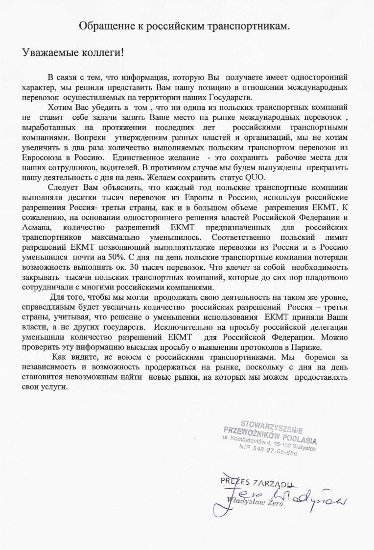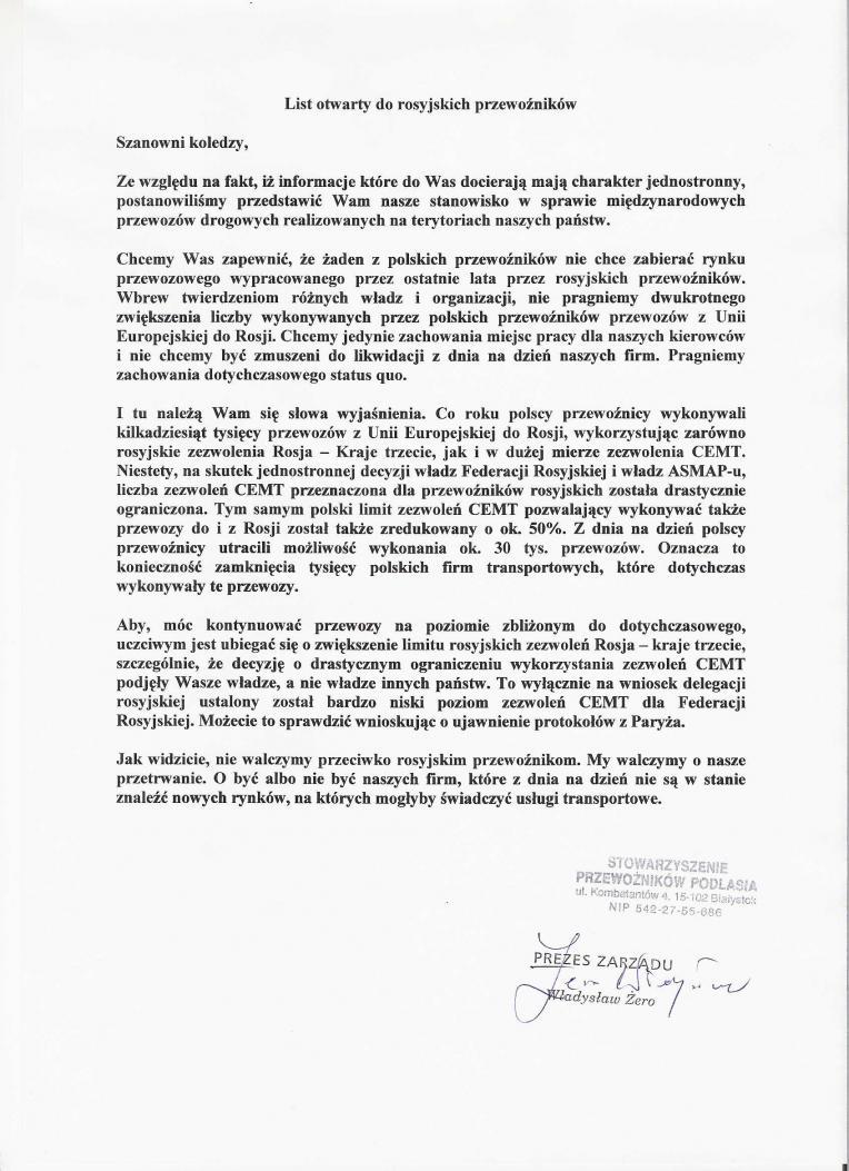 List otwarty wystosowany przez Stowarzyszenie Przewoźników Podlasia do rosyjskich przewoźników