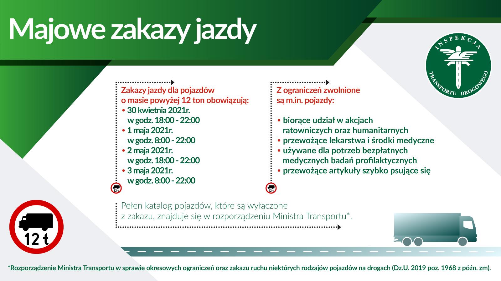 Zakazy wynikają z rozporządzenia Ministra Transportu z dnia 31 lipca 2007 r. w sprawie okresowych ograniczeń oraz zakazu ruchu niektórych rodzajów pojazdów na drogach (t.j. Dz. U. z 2018 r. poz. 2353).