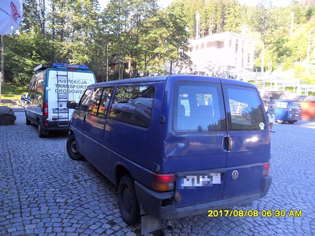 We wtorek, 8 sierpnia 2017 r. inspektorzy z Oddziału Terenowego w Nowym Targu WITD w Krakowie prowadzili działania kontrolne na terenie powiatu tatrzańskiego i nowotarskiego z zakresu przewozu osób. W trakcie kontroli pierwszego pojazdu na terenie miejscowości Zakopane ujawnili następujące nieprawidłowości: korozję podwozia i elementów nośnych, mającą wpływ na sztywność konstrukcji oraz dziury w podwoziu; niesprawny układ hamulcowy; niesprawne tylne drzwi (brak możliwości zamknięcia) - uszkodzone ryglowanie i zamek; popękaną lampę zespoloną tylną oraz niesprawne światło przeciwmgielne i oświetlenie tablicy rejestracyjnej; brak mocowania akumulatora do podwozia; instalację w komorze silnika grożącą zwarciem i pożarem; pęknięty tylny resor; różną rzeźbę bieżnika opon osi napędowej. W kolejnym zatrzymanym do kontroli pojeździe stwierdzili: niepewne mocowanie zderzaka (przód i tył); uszkodzone reflektory przednie i lampy tylne; korozję nadwozia grożąca zranieniem (wystające ostre elementy).