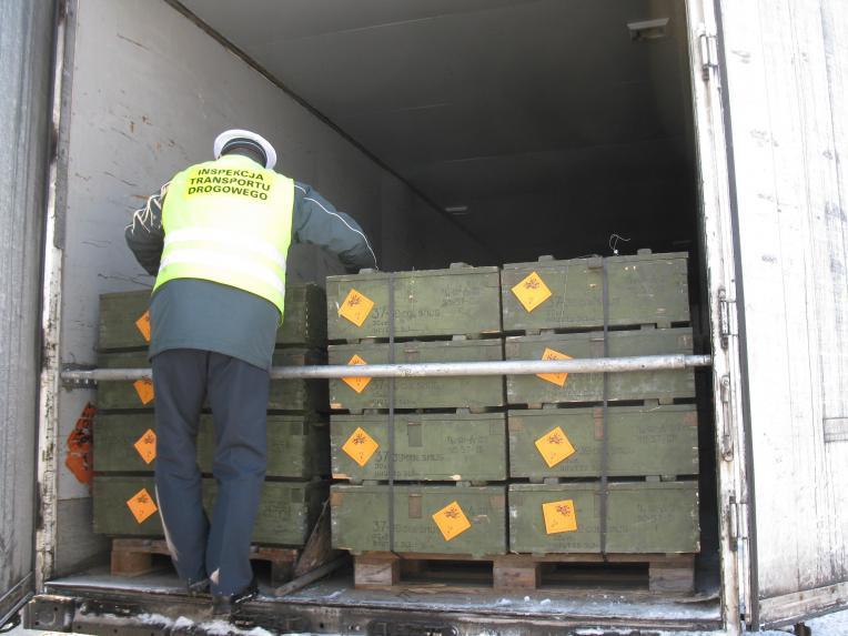 W trakcie oględzin inspektorzy ujawnili brak jakiegokolwiek zabezpieczenia dwóch skrzyń drewnianych zawierających naboje do broni, z ładunkiem rozrywającym. Dalsza kontrola wykazała, że na opakowaniach zewnętrznych ? skrzyniach drewnianych zawierających towar niebezpieczny brakuje wymaganego oznakowania sztuki przesyłki - brak wymaganej prawidłowej nazwy przewozowej i odpowiedniego nr ?UN 0321?. Potencjalne zagrożenie stwarzał również brak oznakowania opakowania potwierdzającego, że było ono badane i spełnia wymagania umowy europejskiej dotyczącej międzynarodowego przewozu drogowego towarów niebezpiecznych ADR oraz fakt, że na jednej ze skrzyń stwierdzono uszkodzenie mocowania odchylanej pokrywy oraz uszkodzenie skrzyni drewnianej polegające na rozwarstwieniu się drewnianej ściany bocznej opakowania. W wyniku stwierdzonych naruszeń nałożono karę w drodze decyzji administracyjnej w wysokości 5 300 zł a pojazd z ładunkiem umieszczono na parkingu do czasu doprowadzenia do stanu zgodnego z prawem.