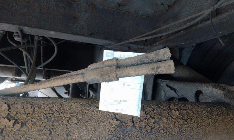 Przy prawym kole na trzeciej osi naczepy brakowało zacisku hamulcowego. Z kolei przewód hamulcowy był odcięty i zaślepiony, co groziło rozszczelnieniem układu pneumatycznego. Pokryta rdzą tarcza hamulcowa tylko potwierdzała, że do usterki doszło sporo wcześniej przed kontrolą drogową, a naczepę używano w takim stanie przez dłuższy czas.