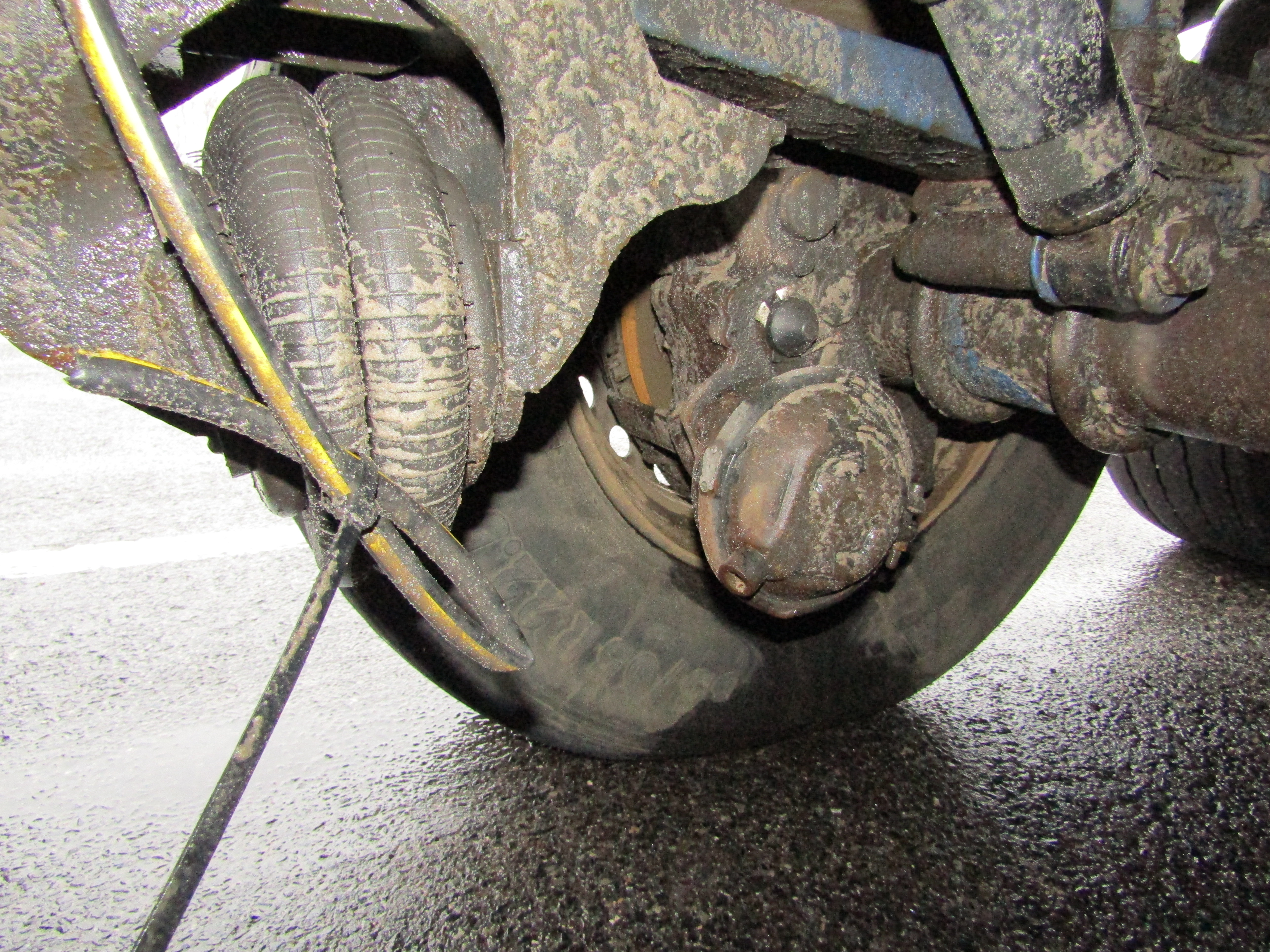 W trakcie kontroli stanu technicznego, inspektorzy zwrócili uwagę na niesprawny układ hamulcowy przy prawym kole na pierwszej osi naczepy. Przewody hamulcowe były odłączone i „zabezpieczone” przed ubytkiem powietrza za pomocą opaski zaciskowej.