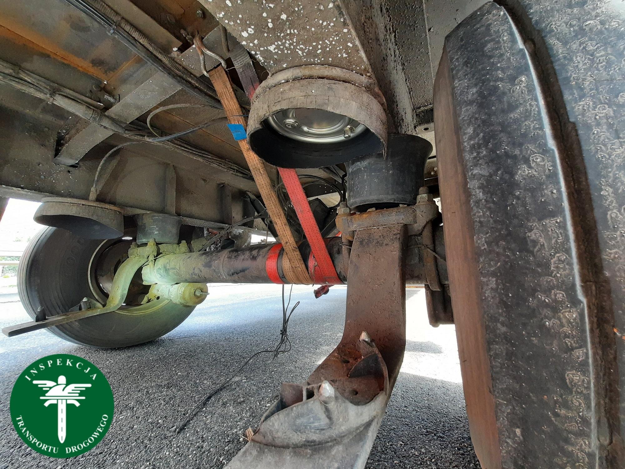 Oś naczepy została wyrwana z mocowań - jak się okazało - w wyniku zdarzenia drogowego w Czechach. Przewoźnik chcąc doprowadzić naczepę do miejsca garażowania zabezpieczył uszkodzony element pasami transportowymi. Inspektorzy z Wojewódzkiego Inspektoratu Transportu Drogowego we Wrocławiu wycofali uszkodzony pojazd z ruchu.