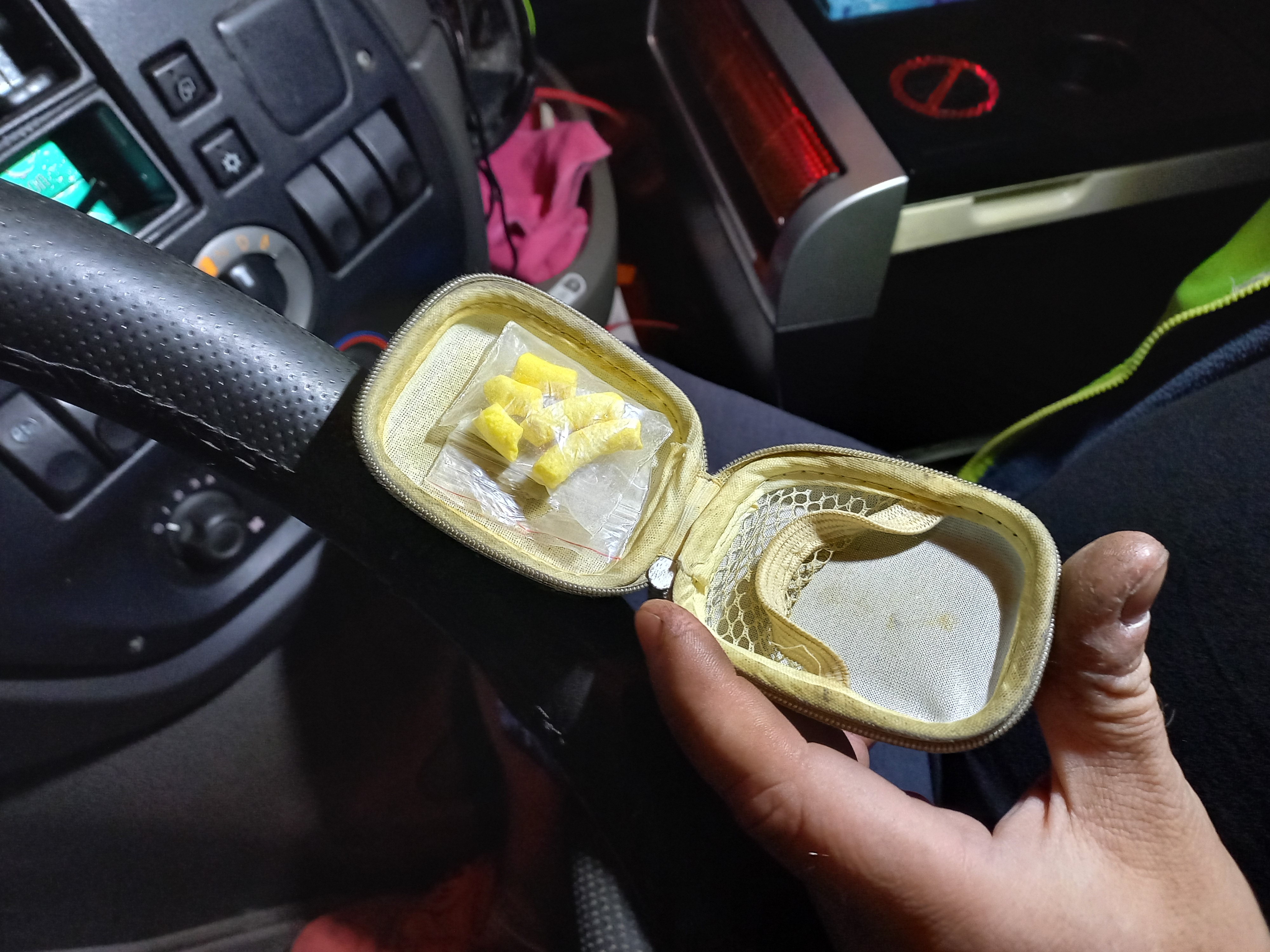 Już na początku czynności kontrolnych, uwagę inspektorów zwróciło nienaturalne zachowanie kierowcy – był pobudzony i zapewniał, że ciężarówka jest w nienagannym stanie technicznym. Inspektor, po wejściu do kabiny ciężarówki, zauważył rozsypany proszek i szklaną lufkę między fotelami. Substancja wyglądała na porcję narkotyku przygotowanego do zażycia. Kierowca to potwierdził i przyznał się, że kilka godzin przed kontrolą zażył taki sam środek odurzający. W rozmowie z inspektorami przyznał się też do posiadania większej ilości narkotyku. Okazał im woreczek strunowy ze znaczną ilością niedozwolonej substancji psychoaktywnej.