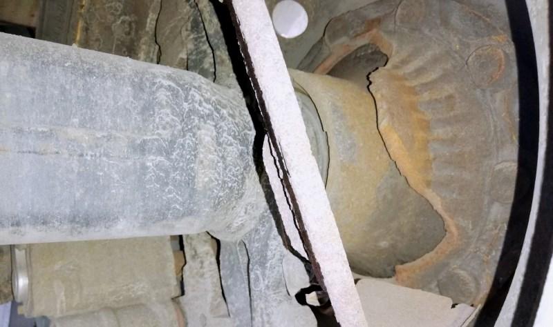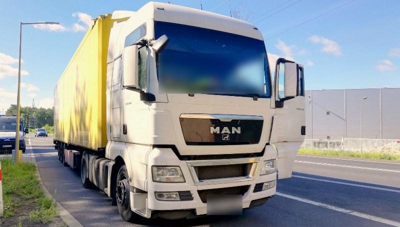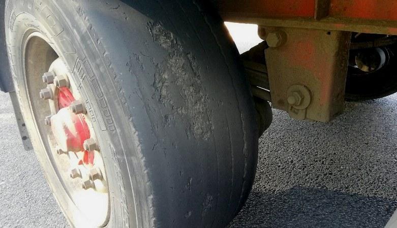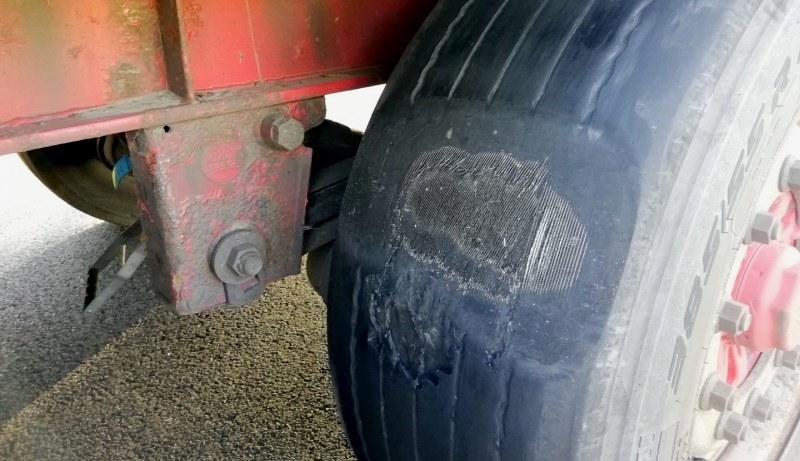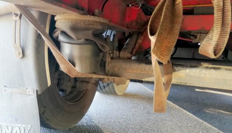 Oba pojazdy nie miały ważnych badań technicznych. Samochód ciężarowy miał niesprawny układ oczyszczania spalin (SCR), pęknięte tarcze hamulcowe i opony o różnej rzeźbie bieżnika na osi napędowej. Natomiast w naczepie na ostatniej osi nie było w ogóle tarczy hamulcowej, a po przeciwnej stronie znajdowała się tylko jej pęknięta połowa. Kierowca wykazał się też nie lada pomysłowością i… odłączył przewód zasilający układ zawieszenia na trzeciej osi naczepy. Używając pasa do zabezpieczania ładunku uniósł lewą stronę osi do góry, mocując ją do ramy naczepy. Prawe koło toczyło się po jezdni, a lewe zwisało w powietrzu. Na znacznej powierzchni jednej z opon widoczny był już stalowy oplot. Inne opony też już dawno nie nadawały się do jazdy z powodu znacznego zużycia bieżnika.