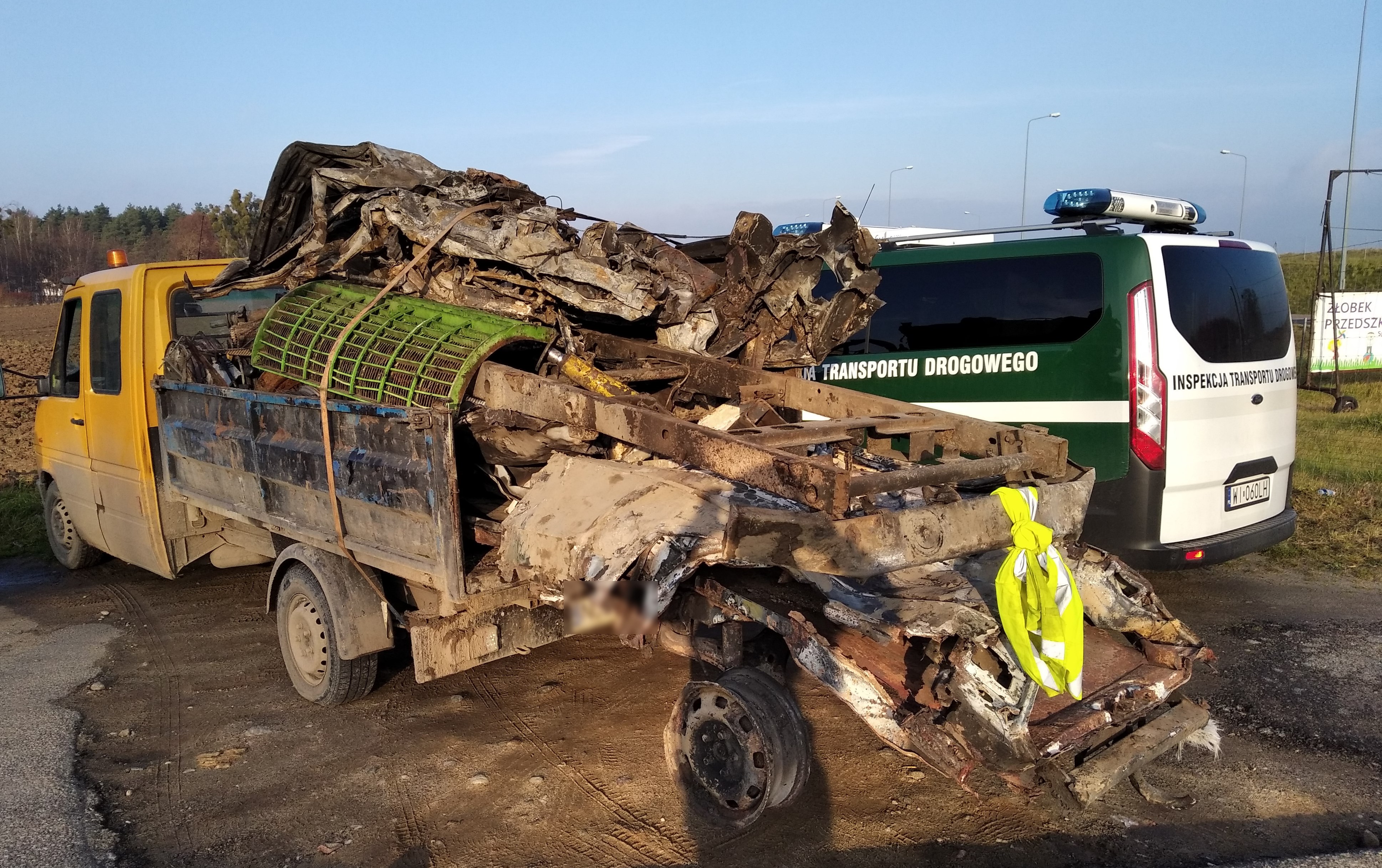 To co zobaczyli na drodze w piątek (26 listopada) na drodze krajowej nr 50 w Spręcewie inspektorzy ITD z Olsztyna na długo pozostanie w ich pamięci. Z tyłu jadącego samochodu widać było tylko wiszące w powietrzu felgi i niekompletne elementy nadwozia jakiegoś pojazdu. Tak załadowany złom, zasłaniał całkowicie tylny pas samochodu, w tym światła zewnętrzne. Dostawczaka natychmiast zatrzymano do kontroli. Okazało się, że metalowe elementy nie były też zabezpieczone i mogły wypaść na drogę. To realne zagrożenie bezpieczeństwa dla uczestników ruchu drogowego. Samochód nie miał również aktualnego przeglądu, więc jego dowód rejestracyjny został zatrzymany. Kierujący próbując „ratować” sytuację – w trakcie trwającej kontroli „oznakował” wystającą poza obrys pojazdu część ładunku - przywiązując na końcu kamizelkę odblaskową. To nie pomogło. Inspektorzy wydali zakaz dalszej jazy, a kierującego ukarali mandatem.