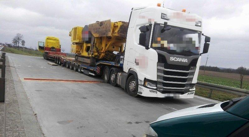 51,7 tony zamiast dopuszczalnych 40 ważył zespół pojazdów przewożący kruszarkę. Naczepa miała niesprawny system ABS, a ciężarówka uszkodzoną oponę. Przewóz wykonywała załoga składająca się z dwóch kierowców, ale w tachografie wykresówkę umieszczono tylko jeden z nich.
