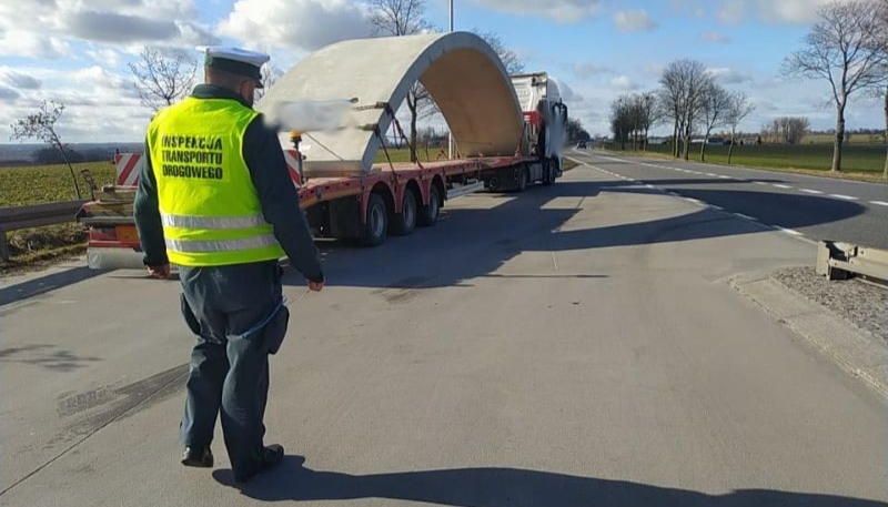 Zestaw przewożący betonowy element był za ciężki i za długi. Przewóz wykonywany był niezgodnie z okazanym zezwoleniem. Nieprawidłowości stwierdzili inspektorzy kujawsko-pomorskiej Inspekcji Transportu Drogowego. Przewoźnikowi grozi teraz kara finansowa.