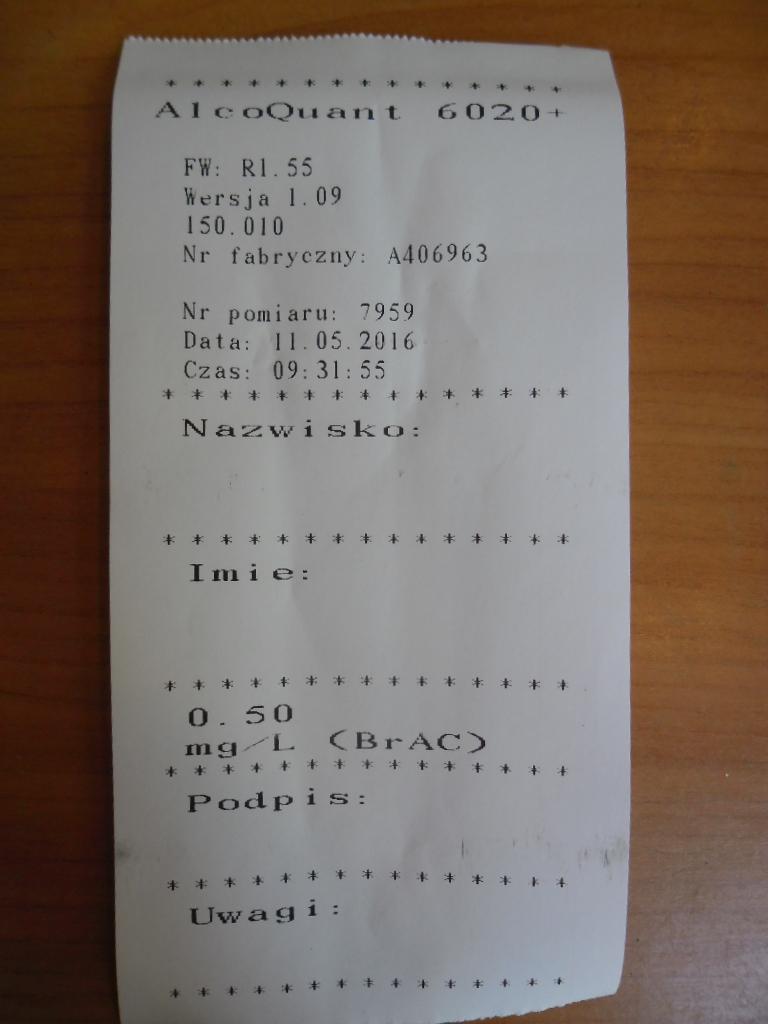 W dniu 11 maja na drodze krajowej nr 10 przy wyjeździe ze Szczecina inspektorzy z WITD w Szczecinie zatrzymali do rutynowej kontroli drogowej samochód ciężarowy. Po otwarciu drzwi kabiny wyczuli od kierującego wyraźną woń alkoholu. W związku z powyższym zbadali kierowcę na zawartość alkoholu w wydychanym powietrzu za pomocą urządzenia alco-blow. Zapaliła się czerwona lampka, w związku z powyższym niezwłocznie powiadomiono o zdarzeniu dyżurnego Policji. Przybyli na miejsce funkcjonariusze dokonali dokładnego pomiaru zawartości alkoholu w wydychanym powietrzu. Pierwszy wynik wyniósł 0,5 mg/l, drugi wykonany po 15 minutach wykazał 0,45 mg/l. W związku z powyższym kierującego wraz z pojazdem do dalszych czynności, przekazano funkcjonariuszom Policji.
