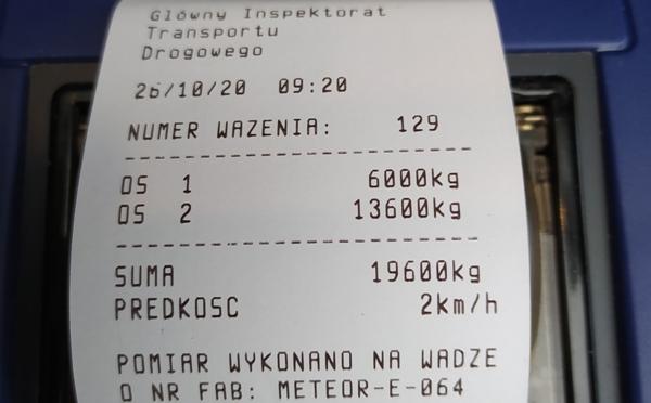 W poniedziałek (26 października) na krajowej 25-tce w Bydgoszczy patrol ITD zatrzymał do kontroli dwuosiową ciężarówkę. Pojazd przewoził siatkę, która jest wykorzystywana jako wzmocnienie asfaltowych nawierzchni jezdni. Auto z ładunkiem ważyło 19,6 tony zamiast dopuszczalnych 18 ton. Zbyt duży tonaż spowodował przekroczenie dozwolonego nacisku pojedynczej osi napędowej samochodu na drogę o 2,1 tony (nacisk wynosił 13,6 tony zamiast 11,5 tony).