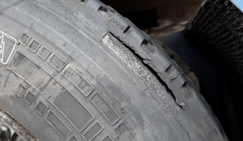 Niezabezpieczony ładunek z uszkodzoną oponą